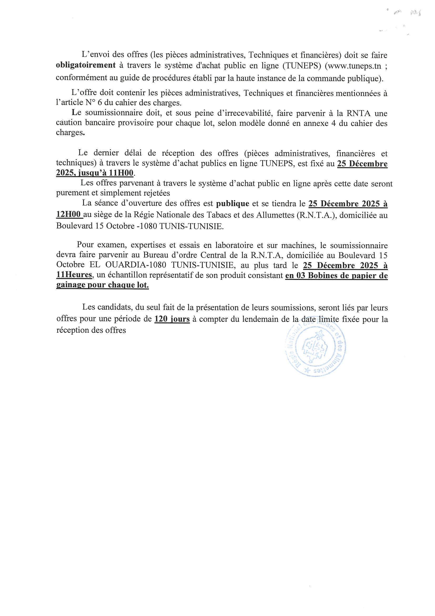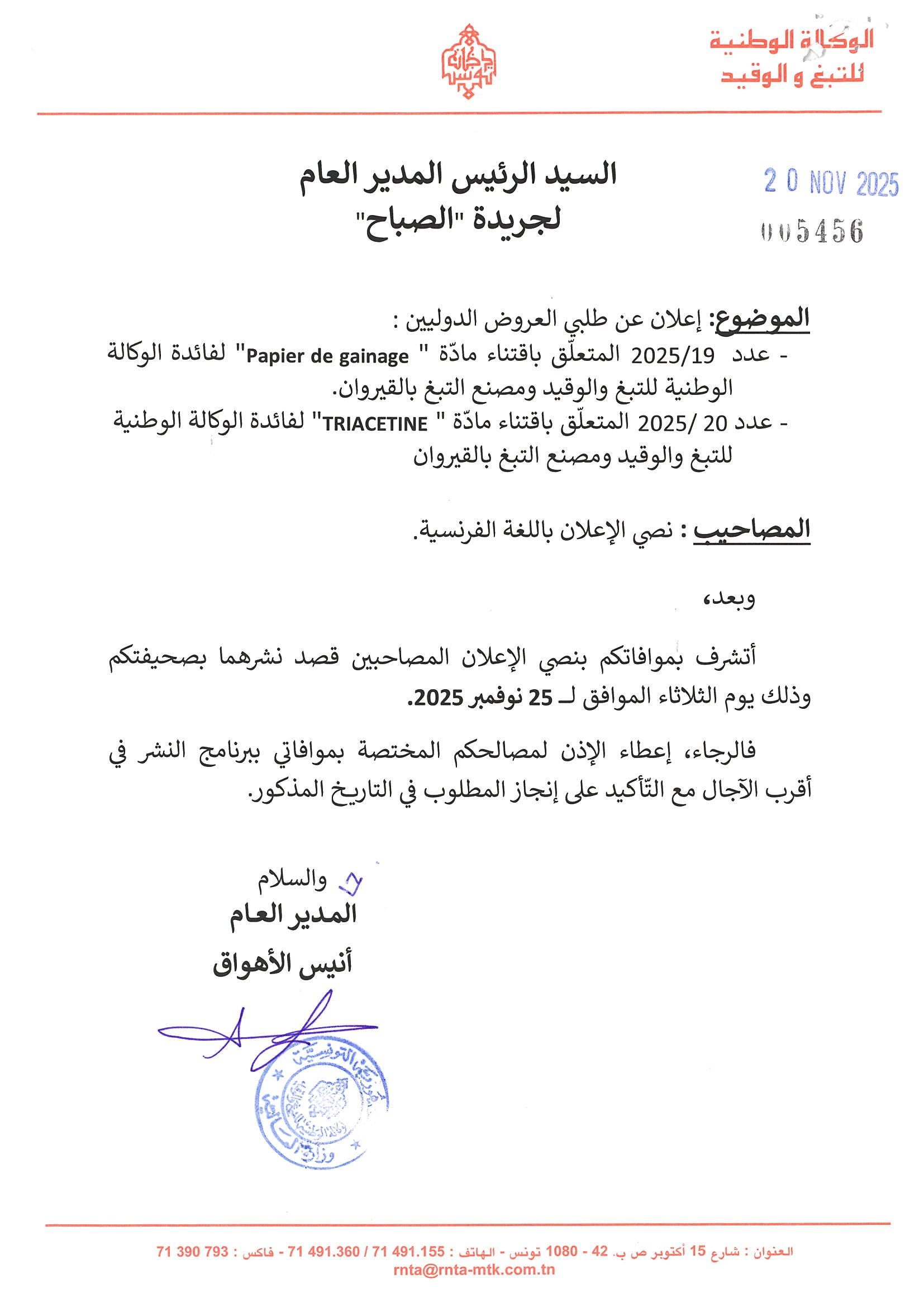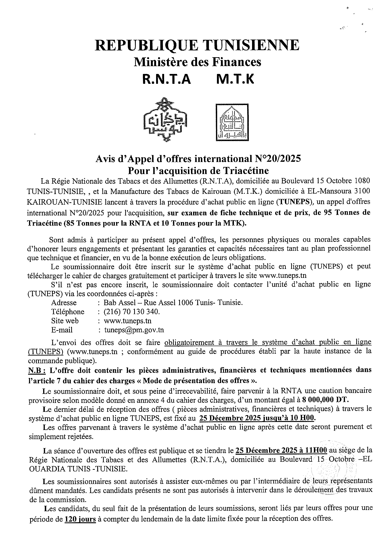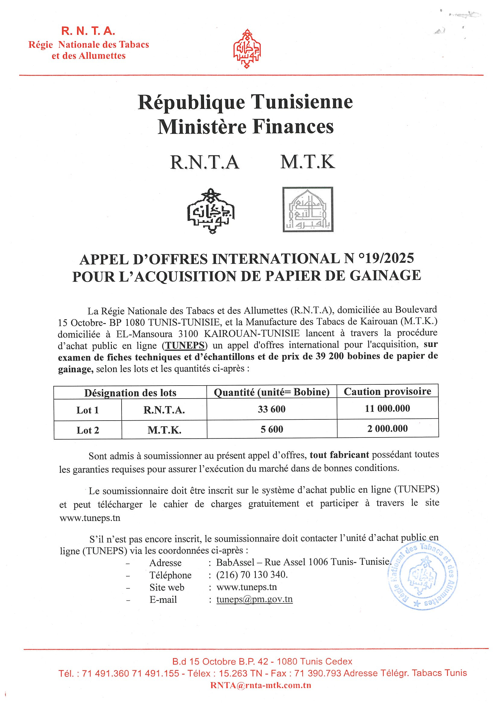 APPEL D'OFFRES INTERNATIONAL N °19/2025 POUR L'ACQUISITION DE PAPIER DE GAINAGE + Avis d'Appel d'offres international N°20/2025 Pour l'acquisition de Triacétine