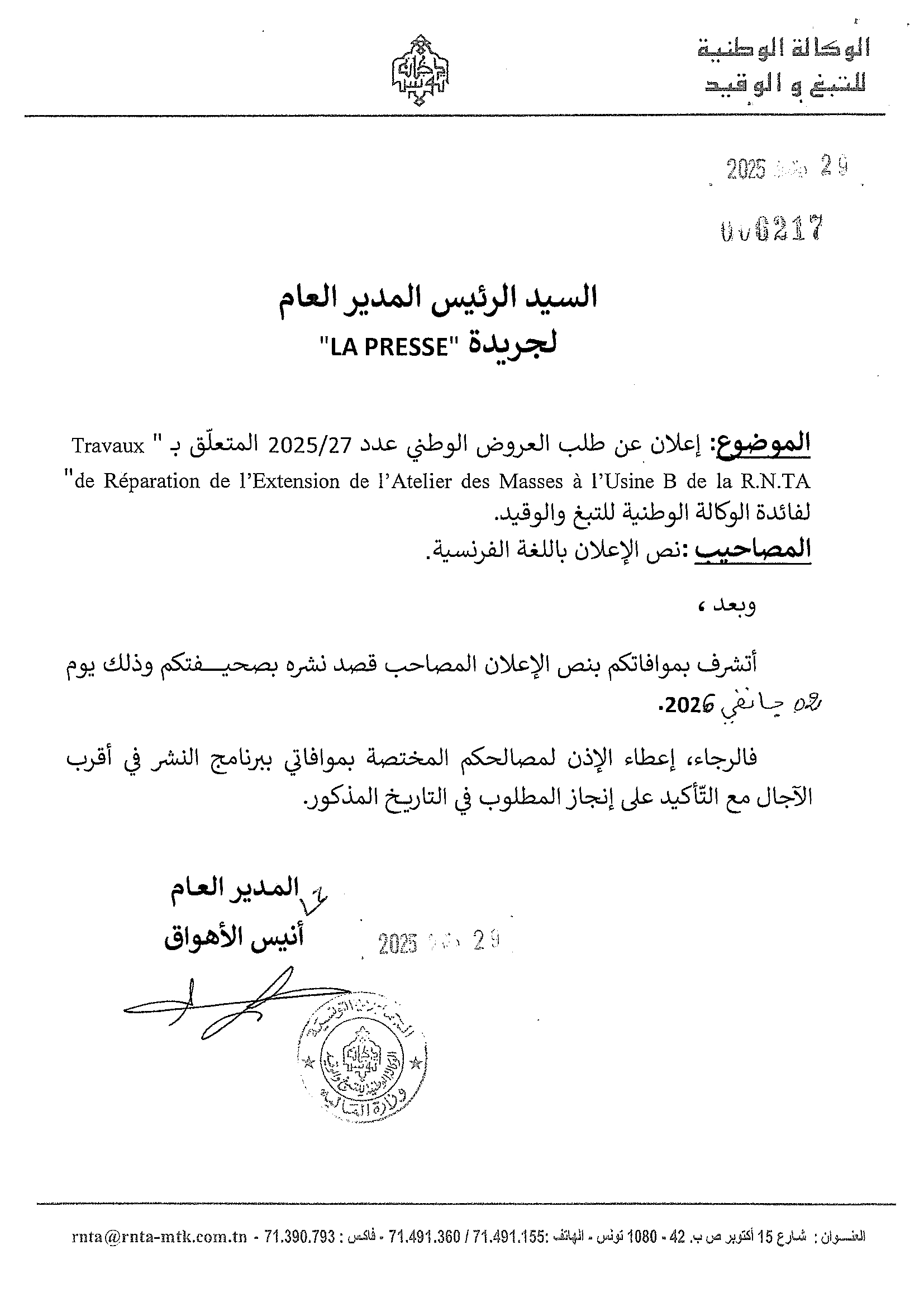 Appel d'offres National N°27/2025 relatif aux Travaux de Réparation de l'Extension de l'Atelier des Masses à l'Usine B de la R.N.TA