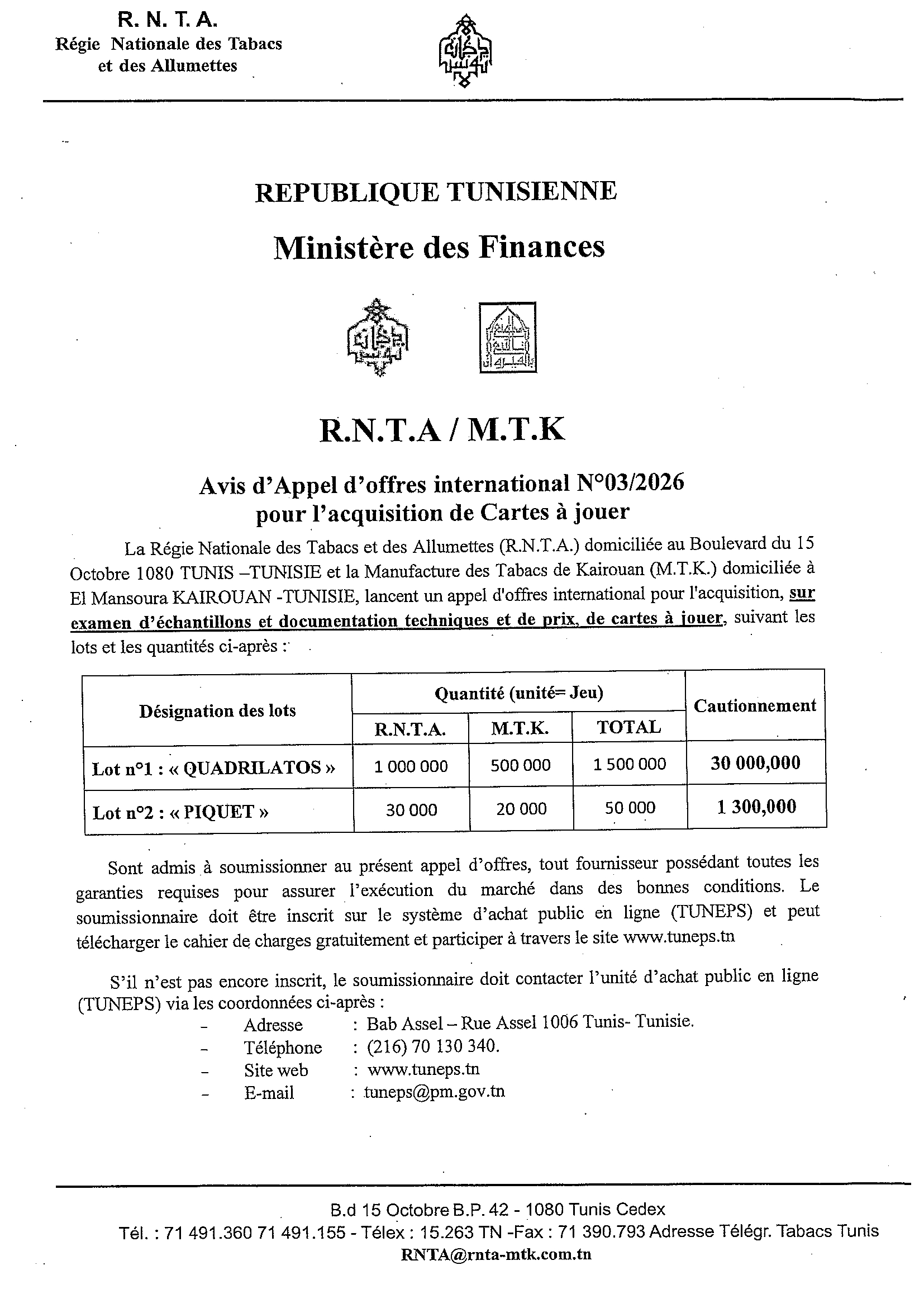 Avis d'appel d'offres international N°03/2026 pour l'acquisition de cartes à jouer