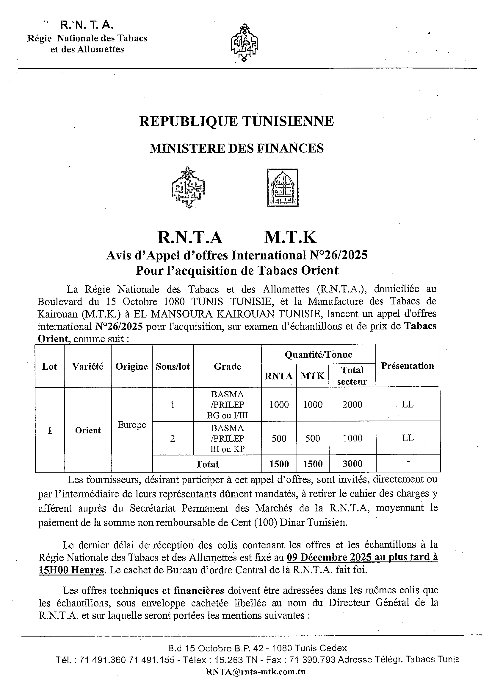 Avis dappel doffres international ndeg262025 pour lacquisition de tabacs orient rnta 0