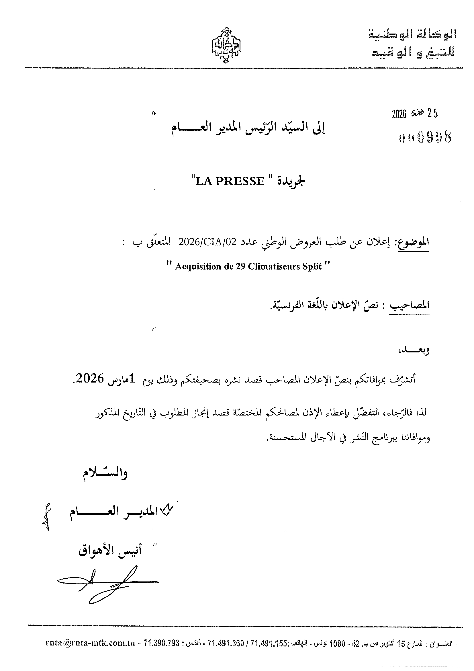 Avis dappel doffres ndeg 02cia2026 relatif lacquisition de 29 climatiseurs split selon 1
