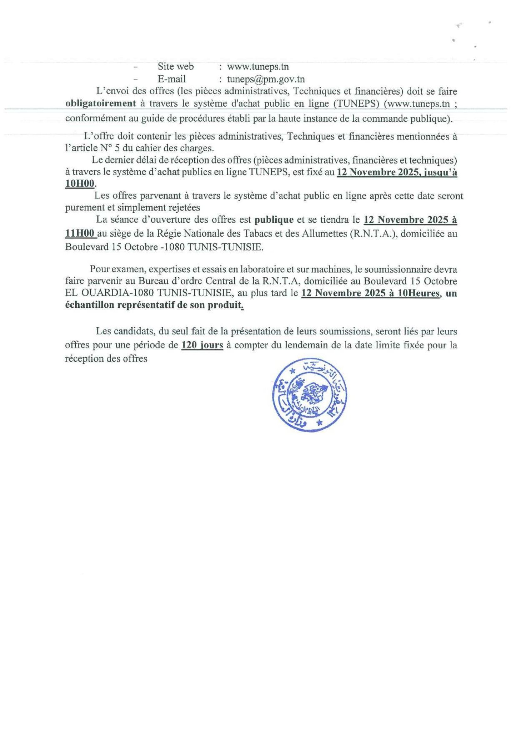 Appel d'offres national n°09/CIA/2025 relatif à l'acquisition des lots suivants: LOT1: Fonds et couvercles, LOT2: Caisse Carton pour bâtonnets filtres