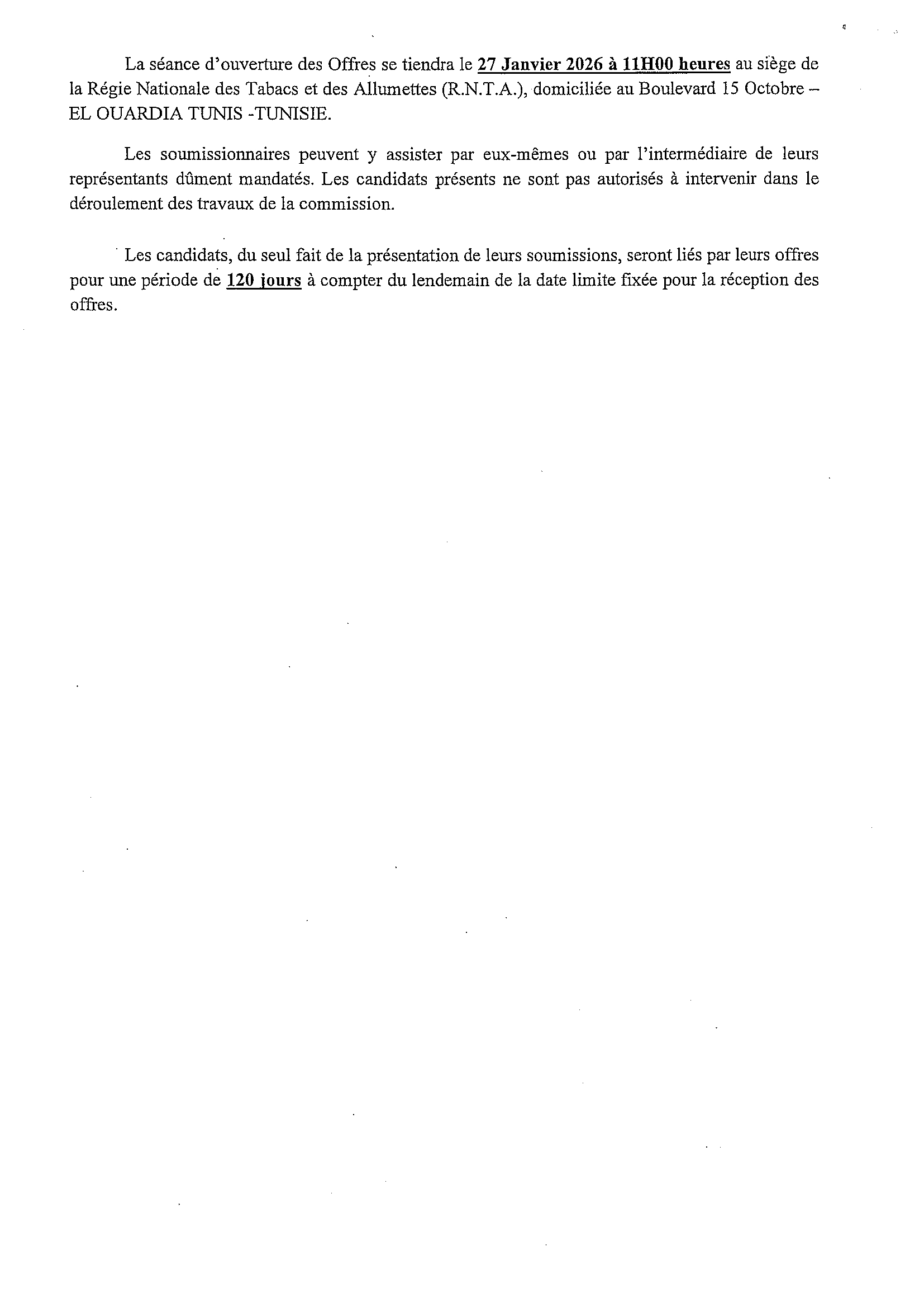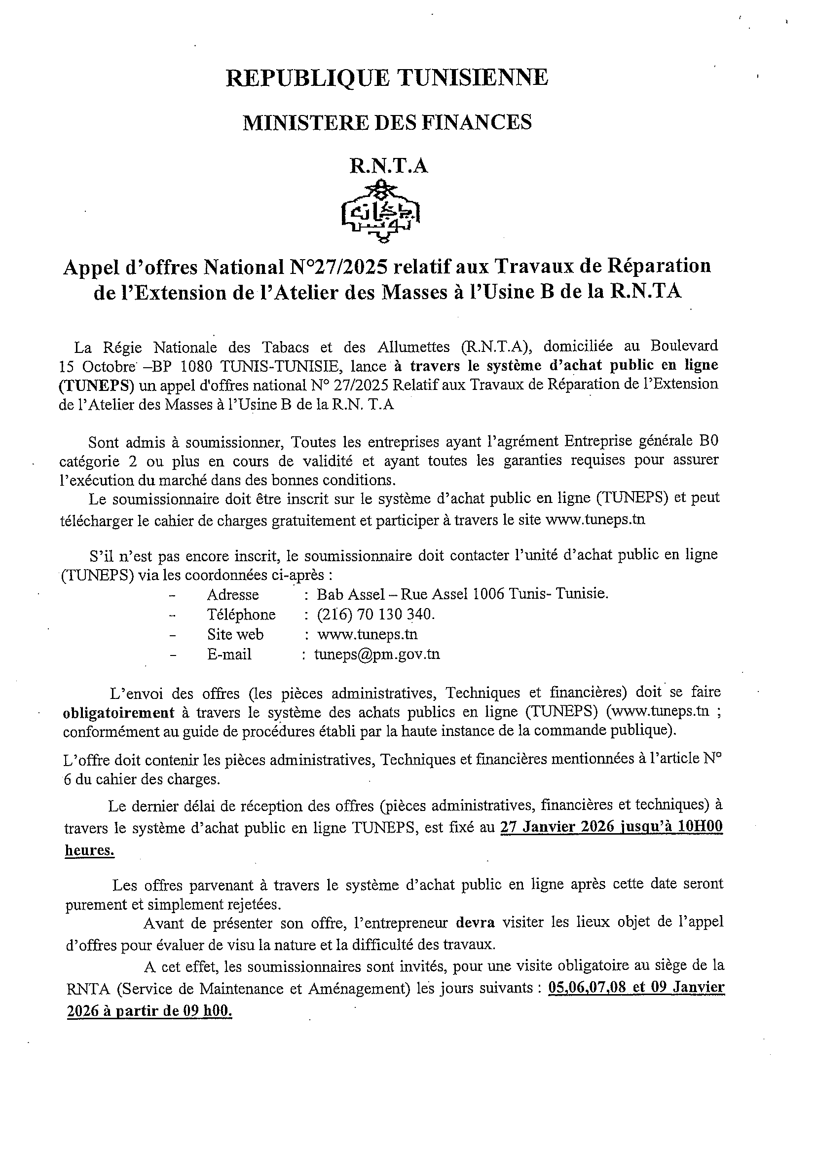 Appel d'offres National N°27/2025 relatif aux Travaux de Réparation de l'Extension de l'Atelier des Masses à l'Usine B de la R.N.TA