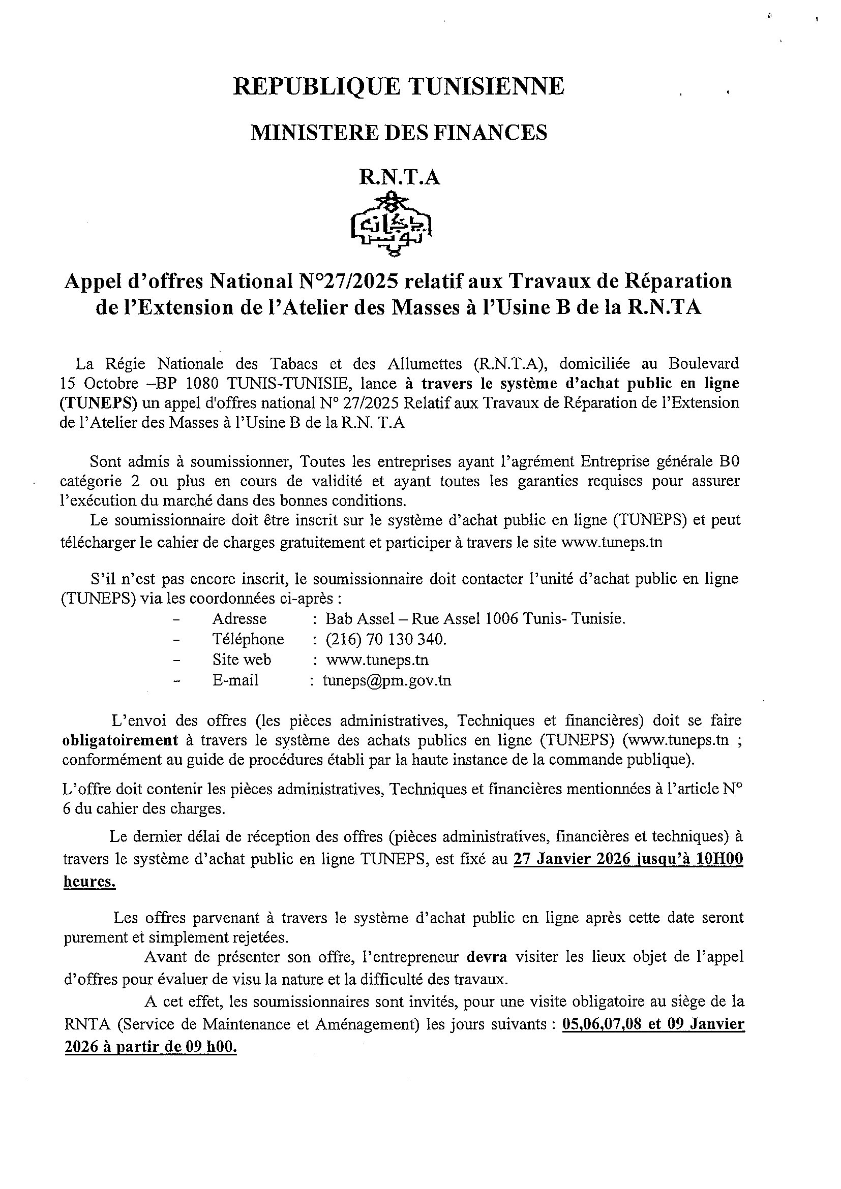Appel d'offres National N°27/2025 relatif aux Travaux de Réparation de l'Extension de l'Atelier des Masses à l'Usine B de la R.N.TA