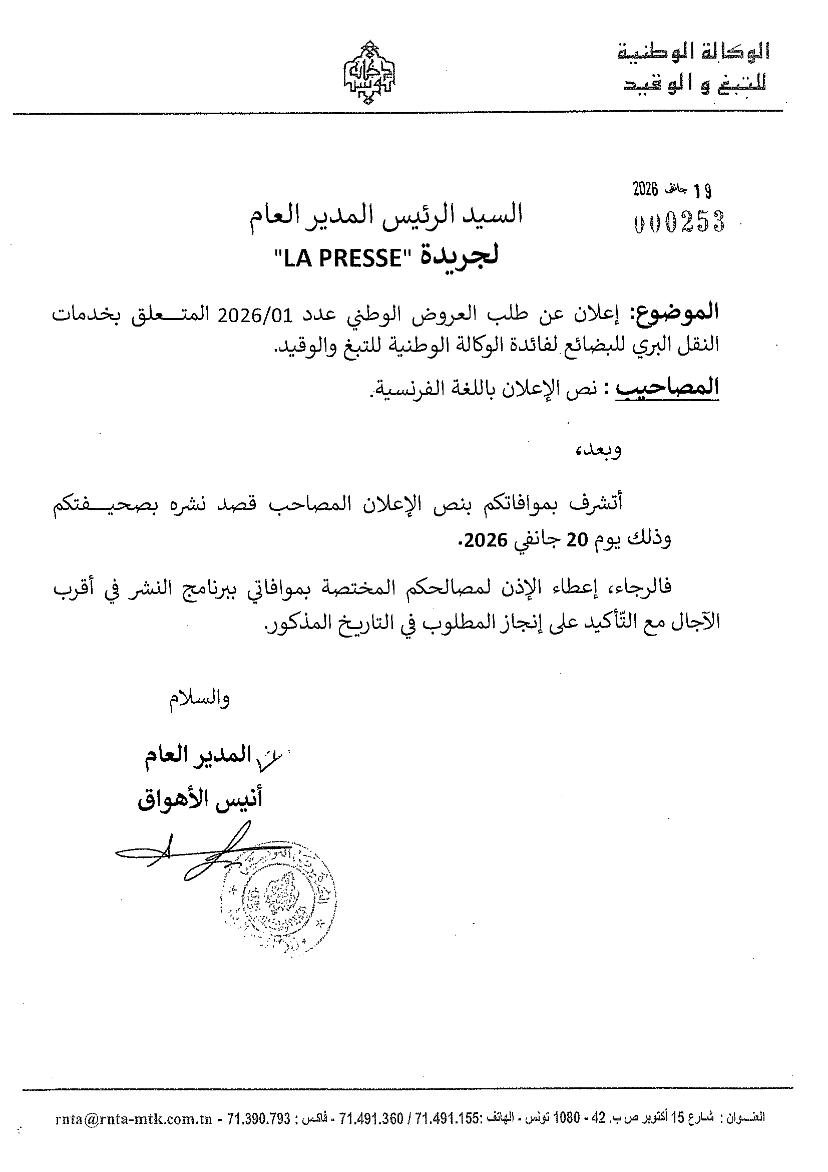 Avis d'Appel d'offres National N°01/2026 Portant sur les prestations de transport terrestre