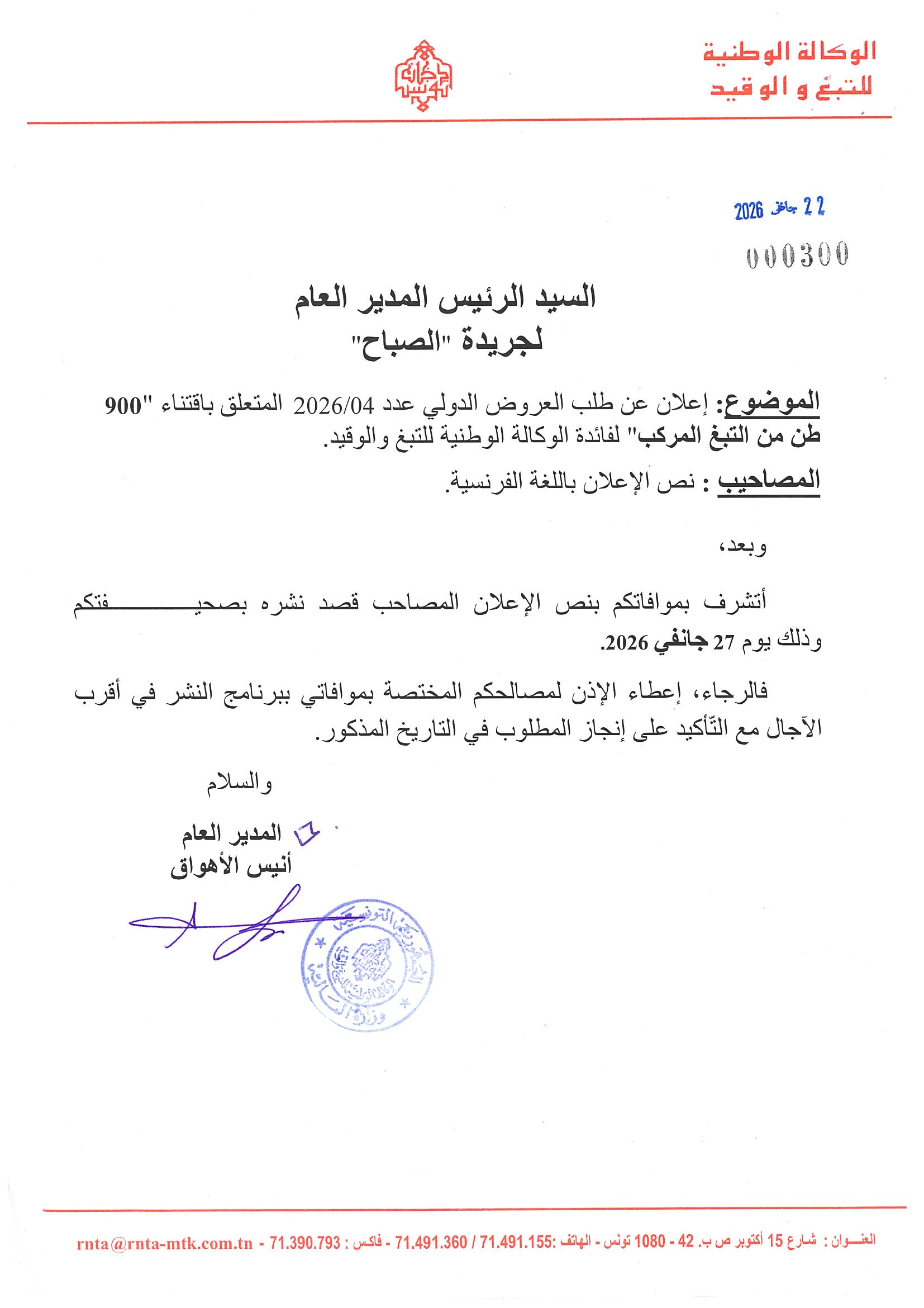 Appel d'offres international N°04/2026 relatif à l'achat de tabac reconstitué