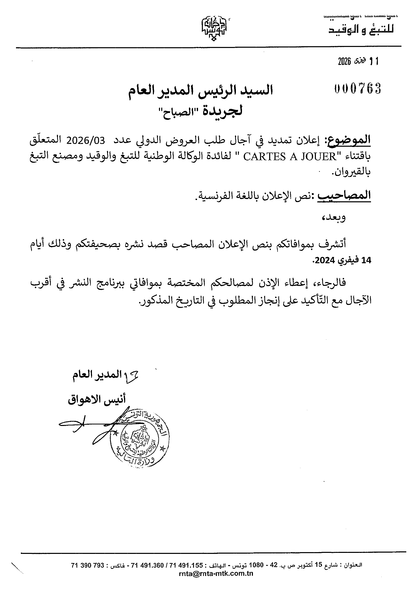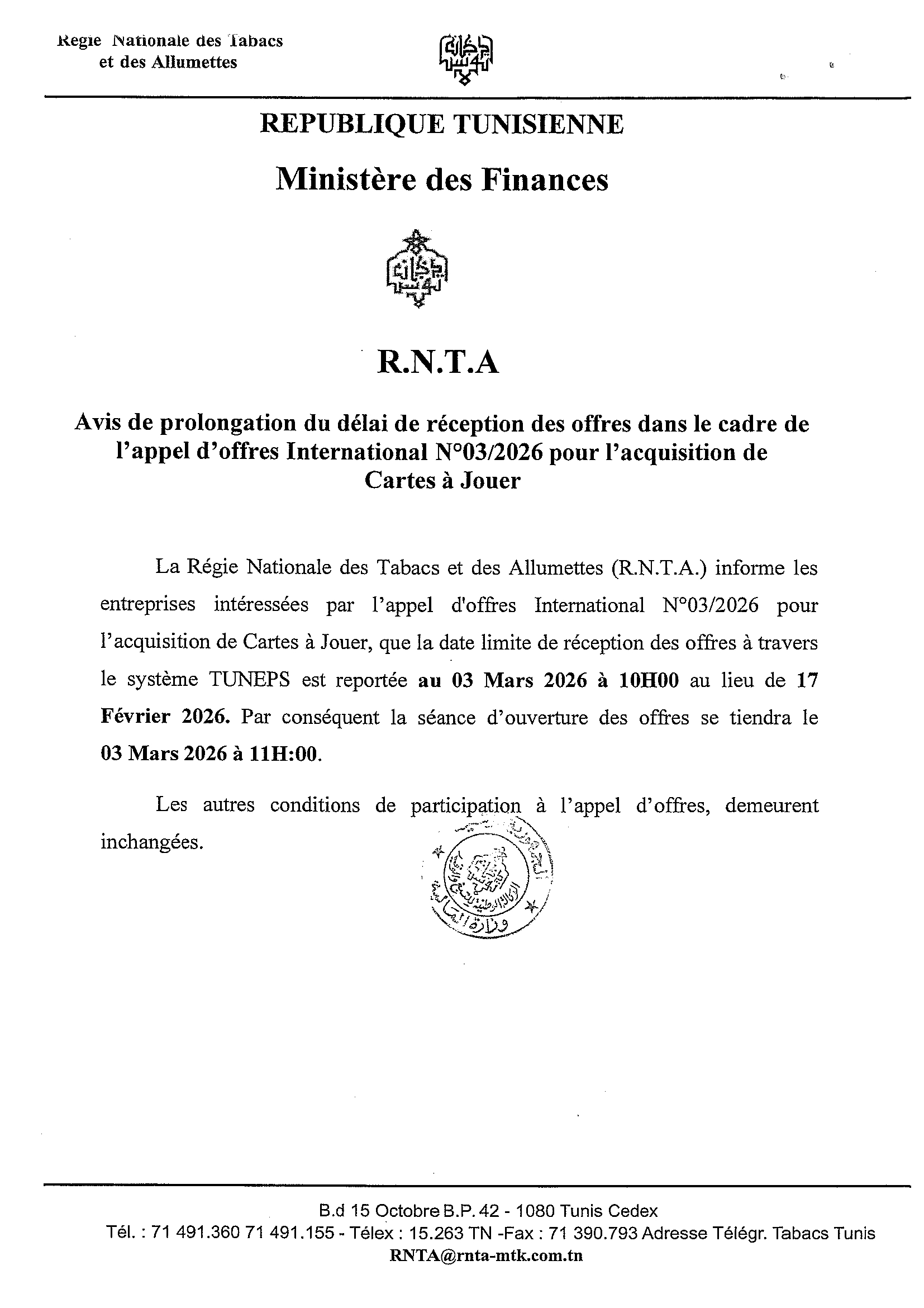 Avis de prolongation du délai de réception des offres dans le cadre de l'appel d'offres International N°03/2026 pour l'acquisition de Cartes à Jouer