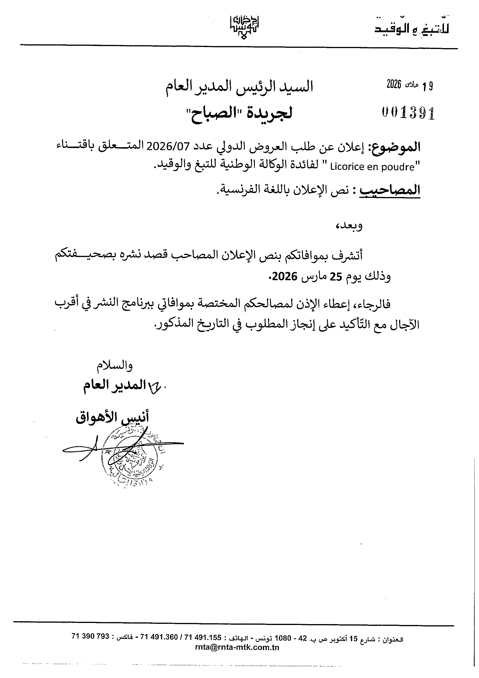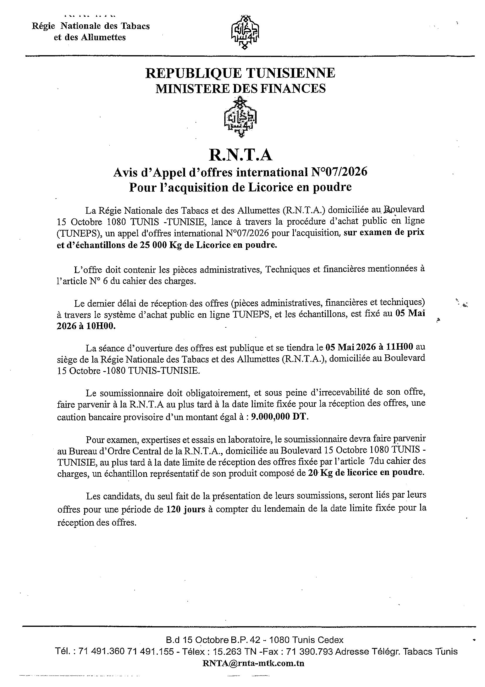 Avis d'Appel d'offres international N°07/2026 Pour l'acquisition de Licorice en poudre