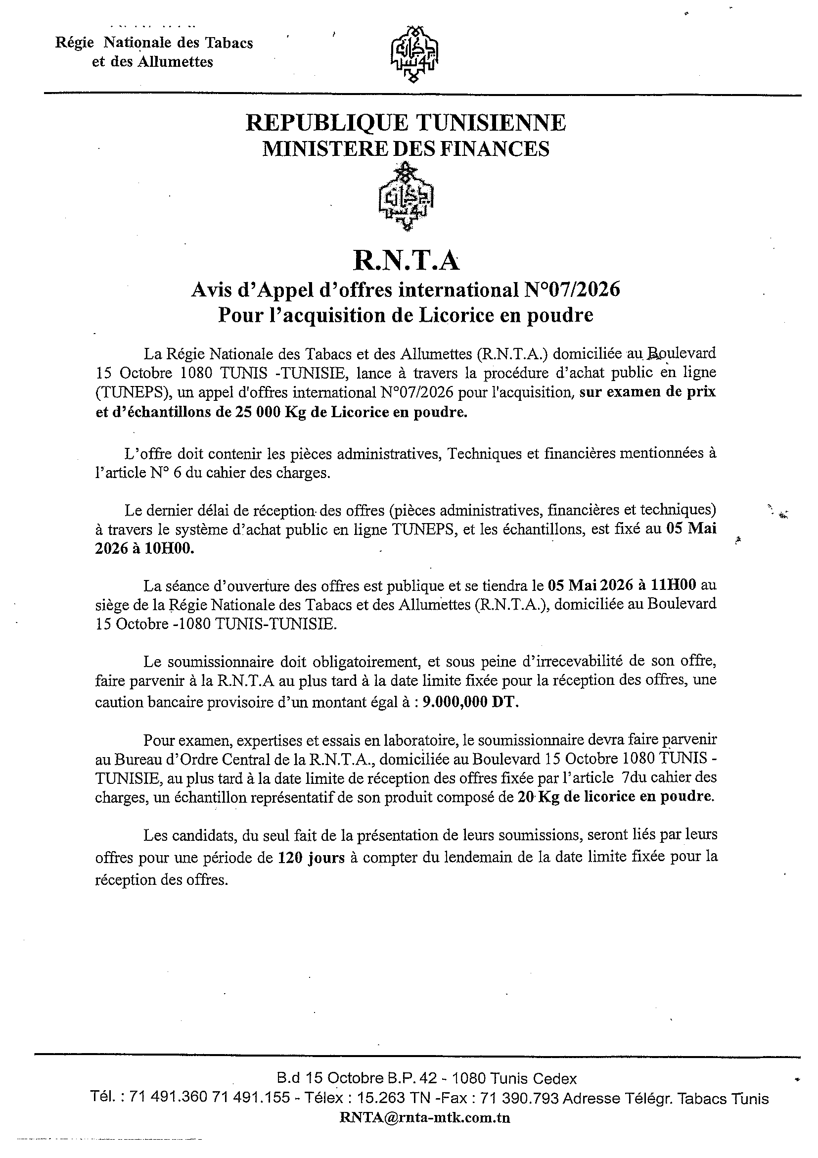 Avis d'Appel d'offres international N°07/2026 Pour l'acquisition de Licorice en poudre