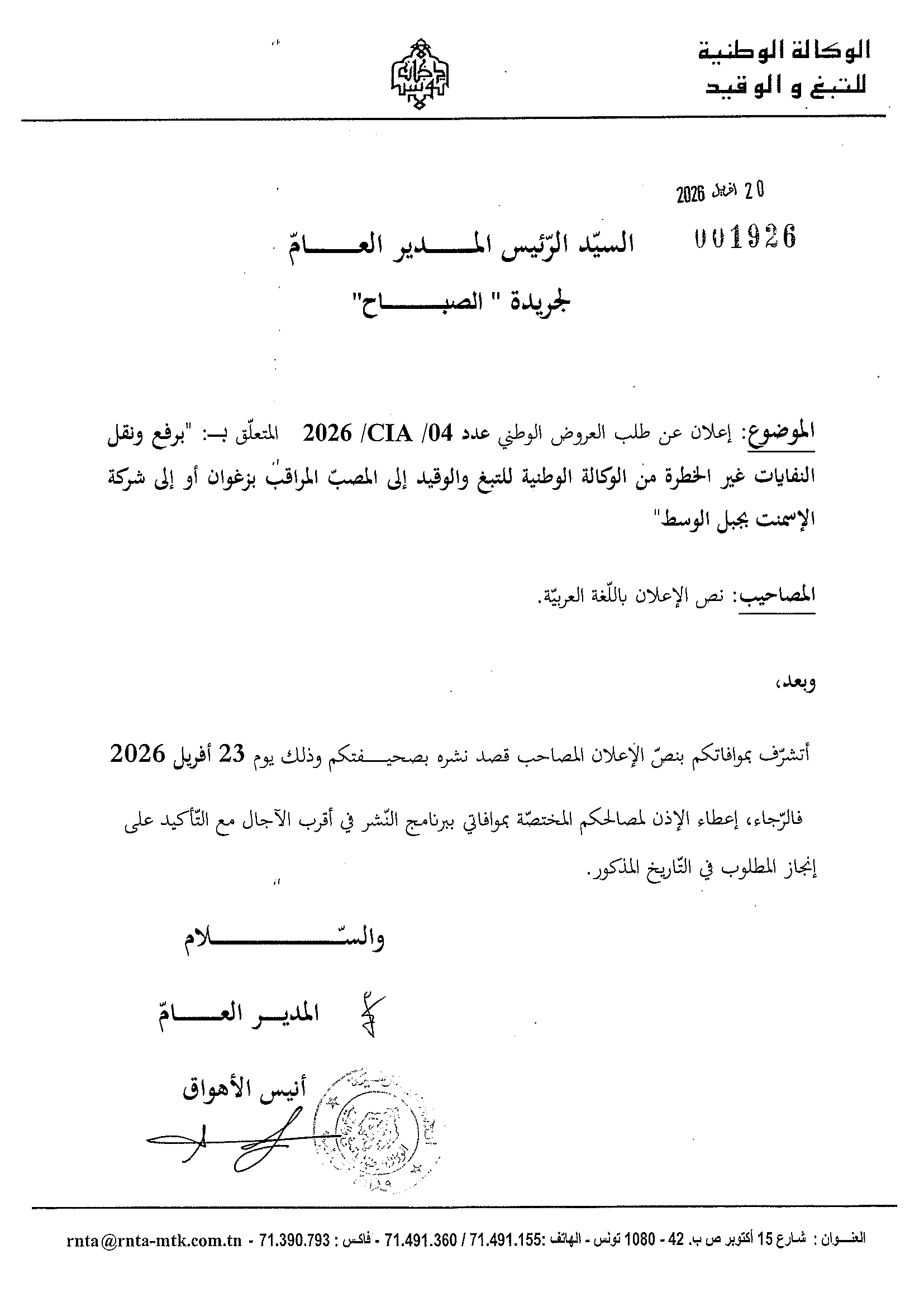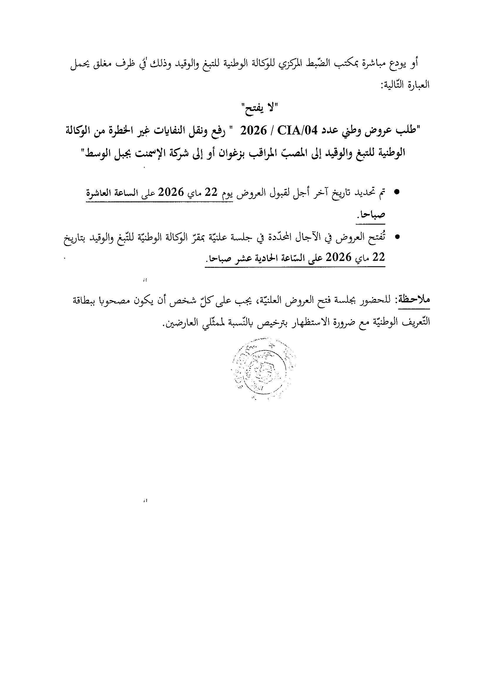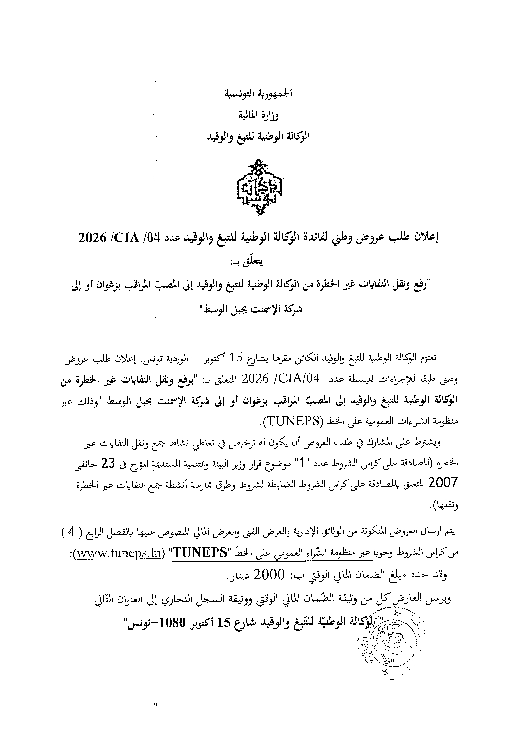 Appel d'offres national n° 04/CIA/2016 au profit de la RNTA : la collecte et le transport des déchets non dangereux de la RNTA vers la décharge contrôlée de Zaghouan ou à la cimenterie de Jebel El Oust