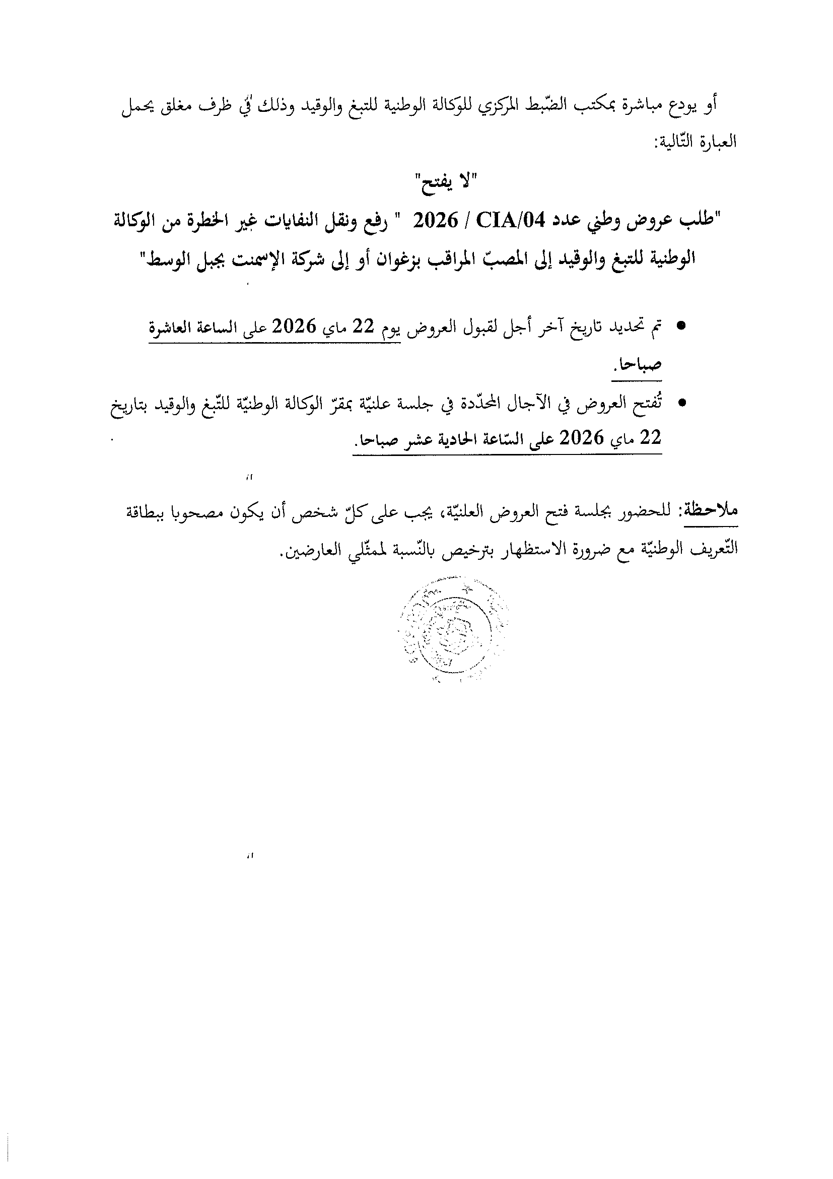 Appel d'offres national n° 04/CIA/2016 au profit de la RNTA : la collecte et le transport des déchets non dangereux de la RNTA vers la décharge contrôlée de Zaghouan ou à la cimenterie de Jebel El Oust