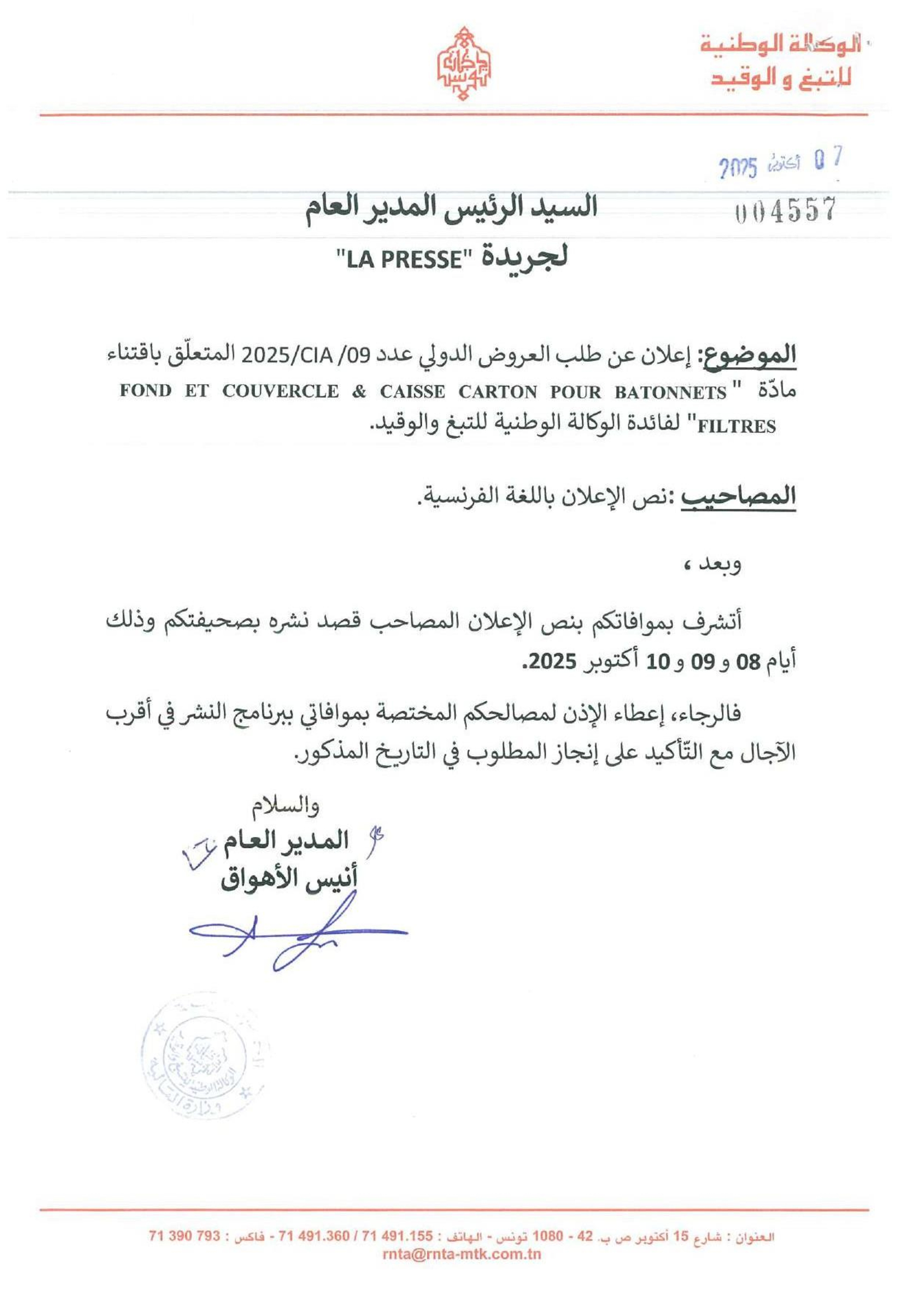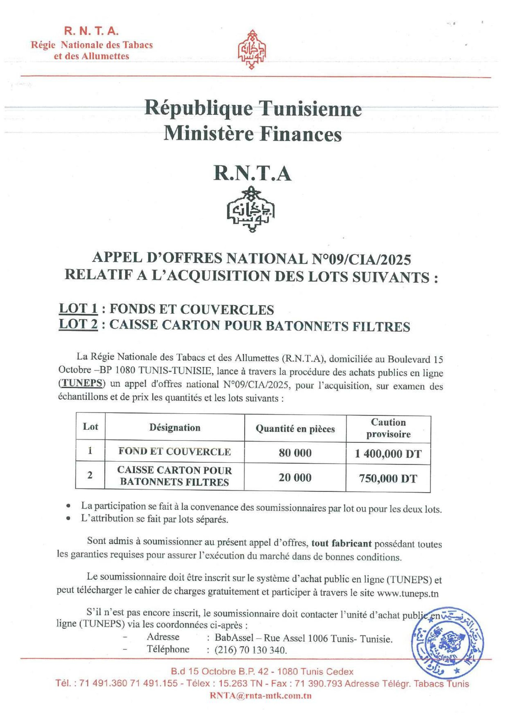 Appel d'offres national n°09/CIA/2025 relatif à l'acquisition des lots suivants: LOT1: Fonds et couvercles, LOT2: Caisse Carton pour bâtonnets filtres