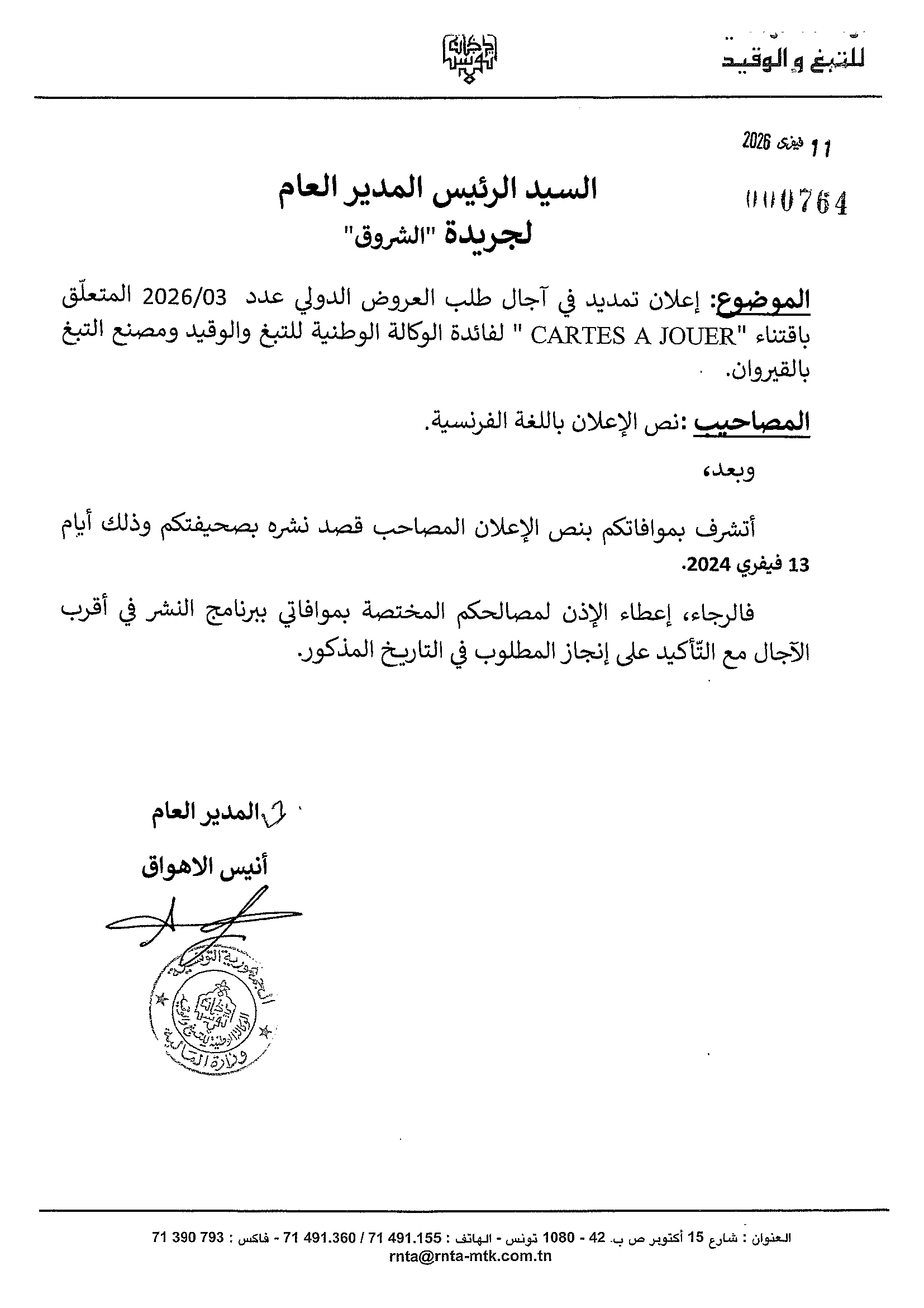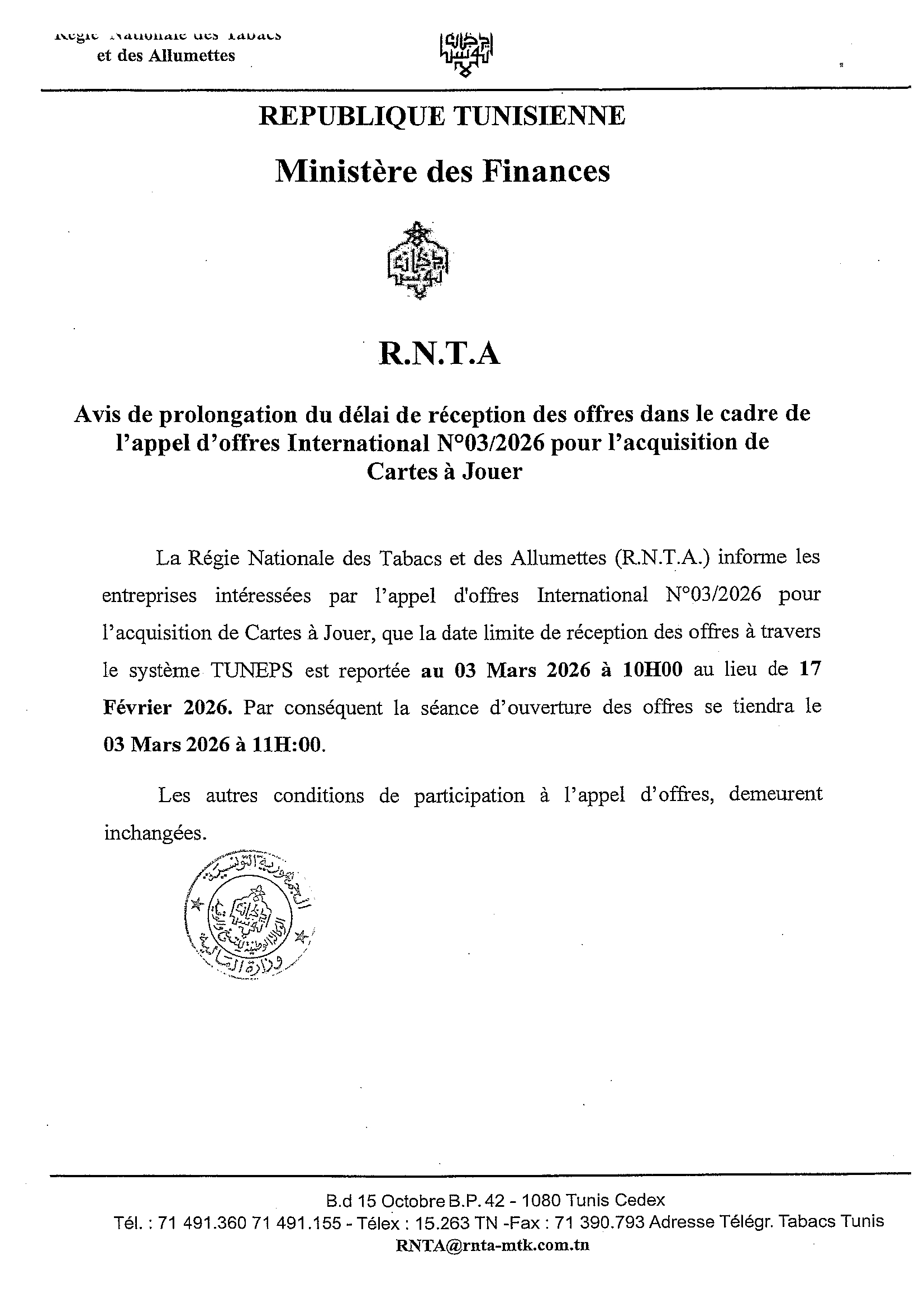 Avis de prolongation du délai de réception des offres dans le cadre de l'appel d'offres International N°03/2026 pour l'acquisition de Cartes à Jouer