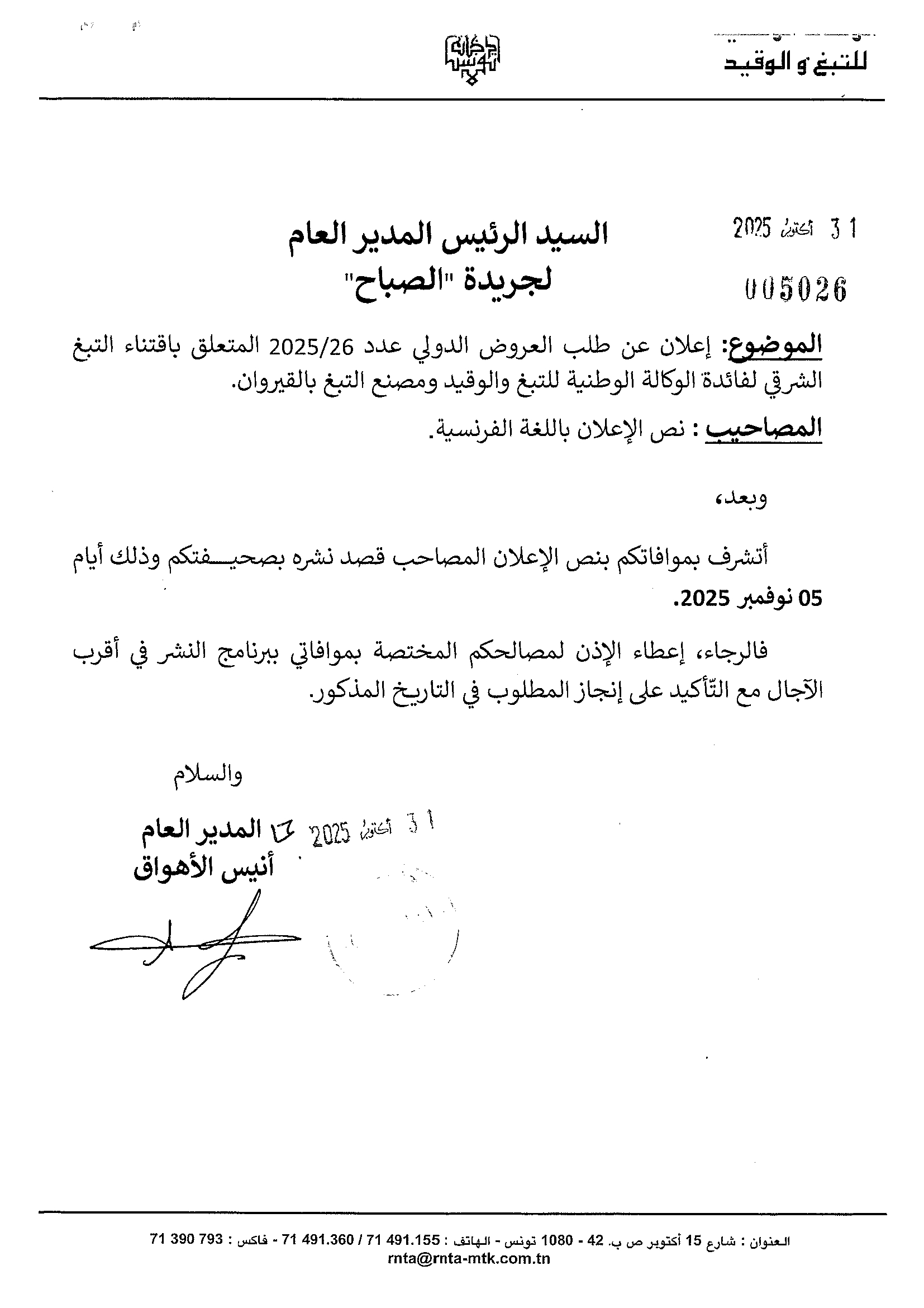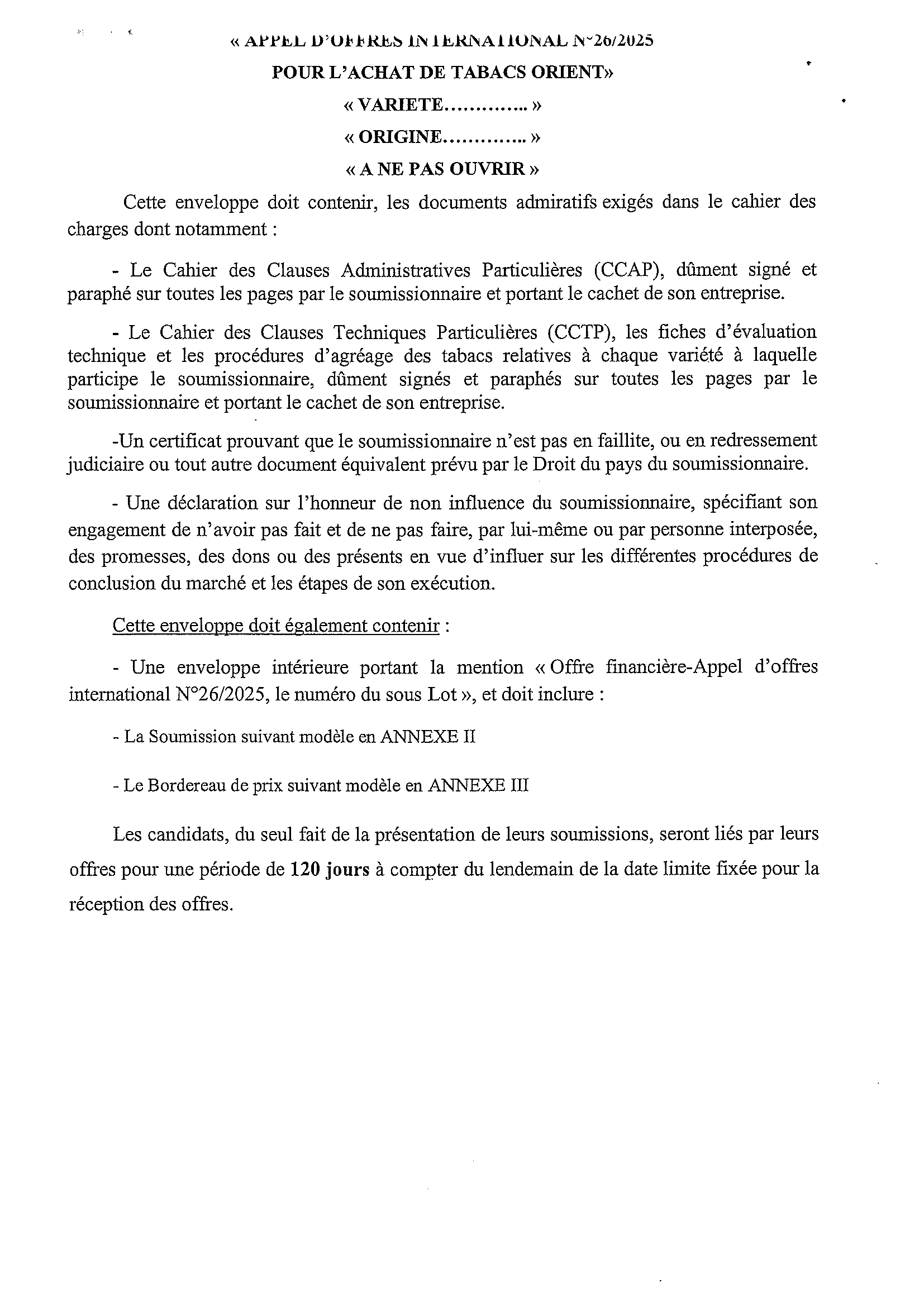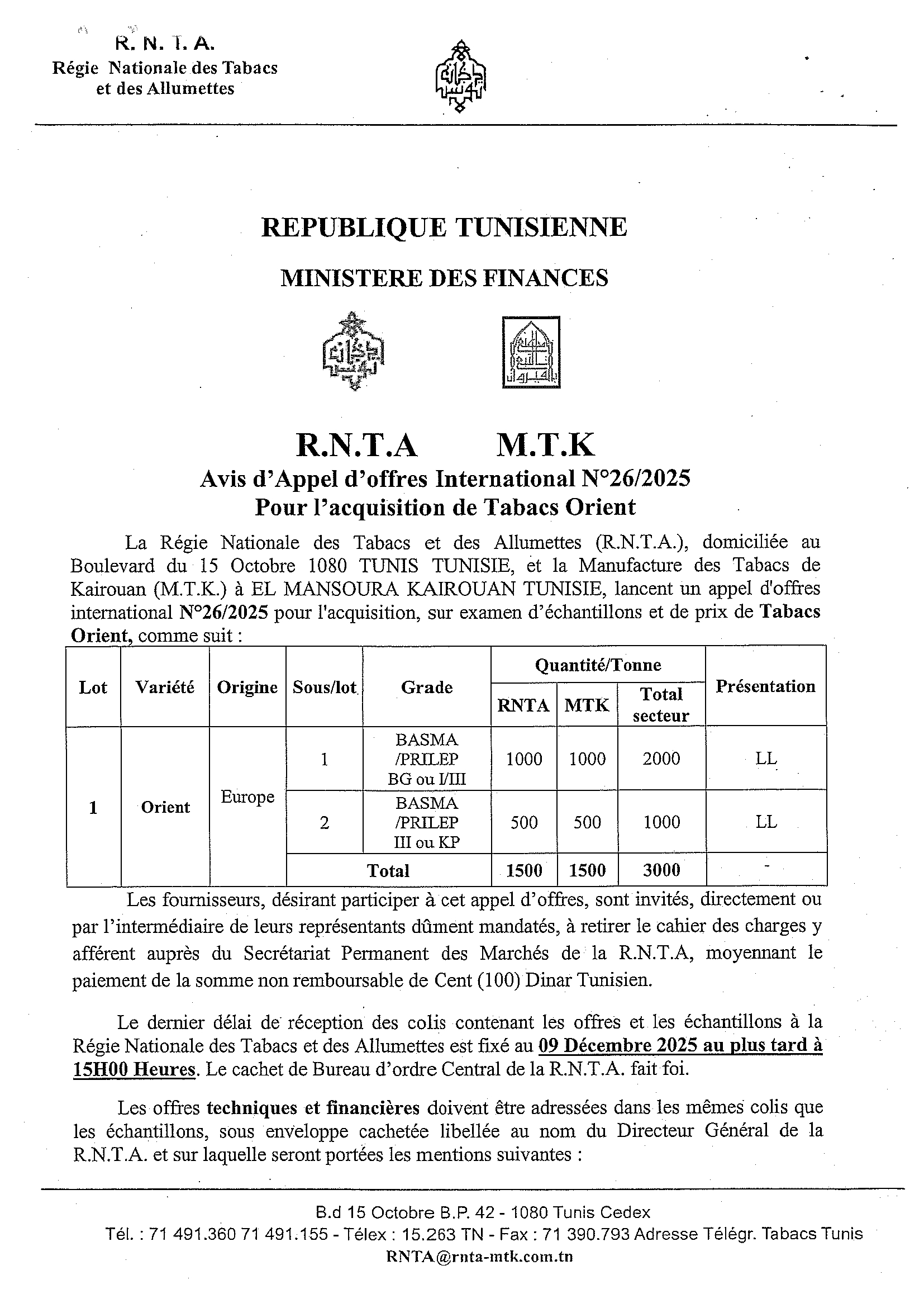 Avis d'Appel d'offres International N°26/2025 Pour l'acquisition de Tabacs Orient (RNTA-MTK)