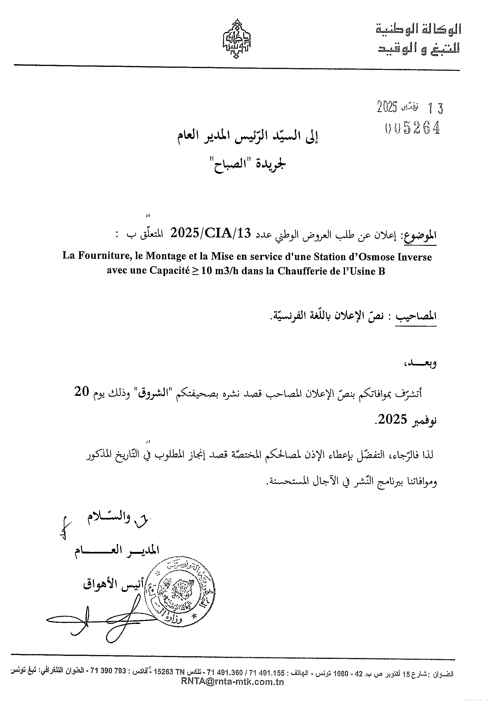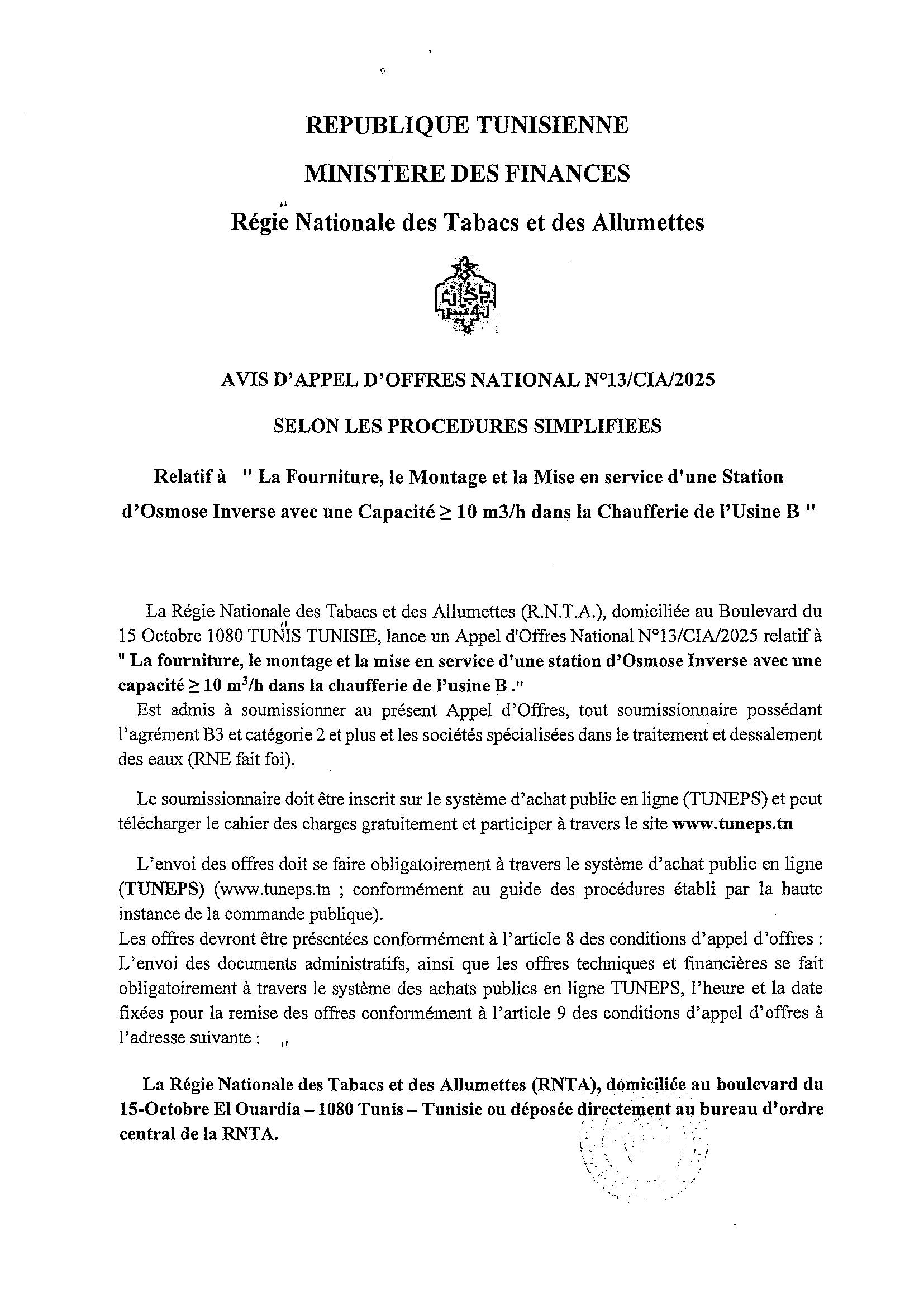 AVIS D'APPEL D'OFFRES NATIONAL N°13/CIA/2025 SELON LES PROCEDURES SIMPLIFIEES Relatif à "La Fourniture, le Montage et la Mise en service d'une Station d'Osmose Inverse avec une Capacité ≥ 10 m3/h danş la Chaufferie de l'Usine B"
