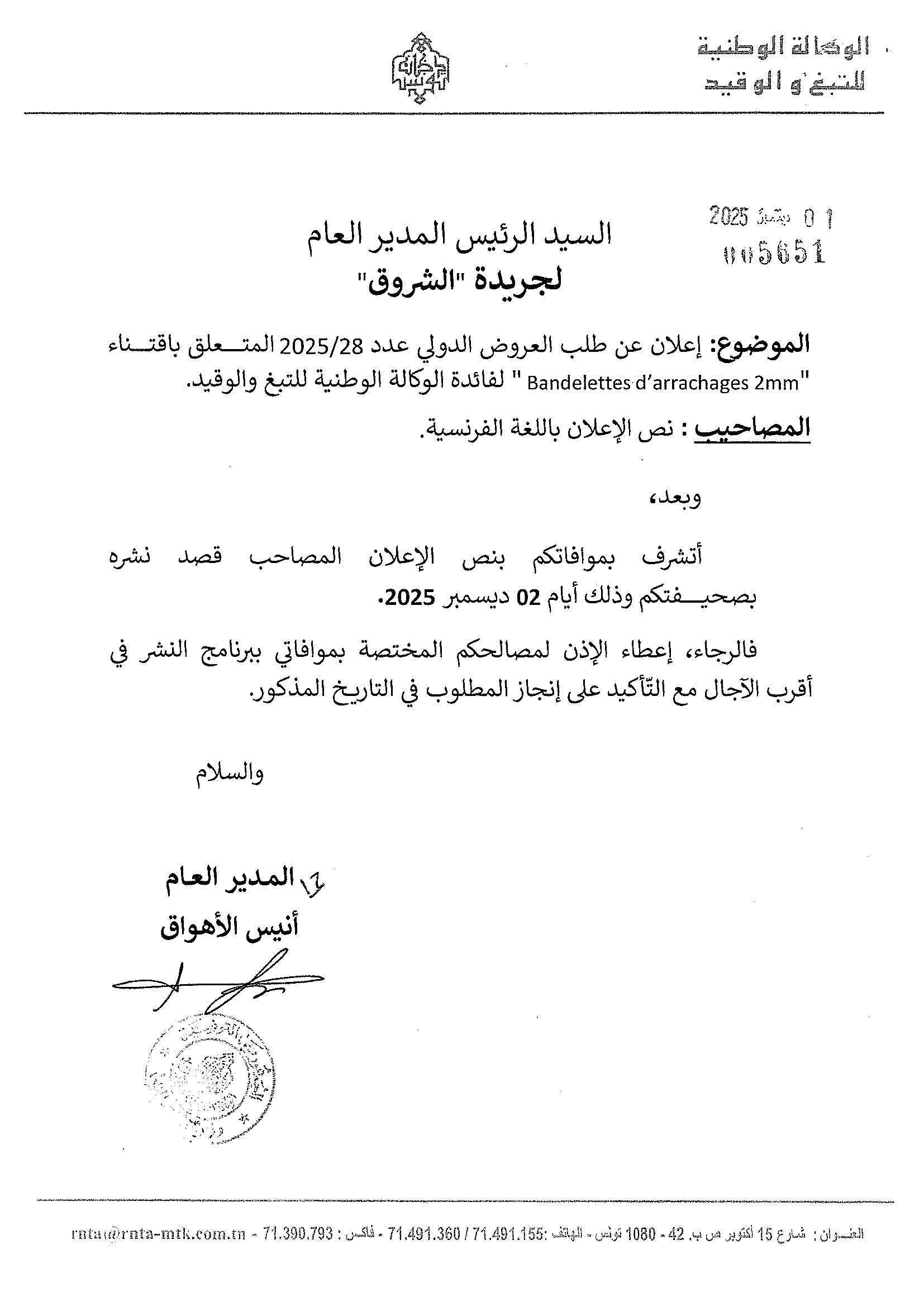 APPEL D'OFFRES INTERNATIONAL N°28/2025 RELATIF A L'ACQUISITION DE BANDELETTES D'ARRACHAGE 2mm