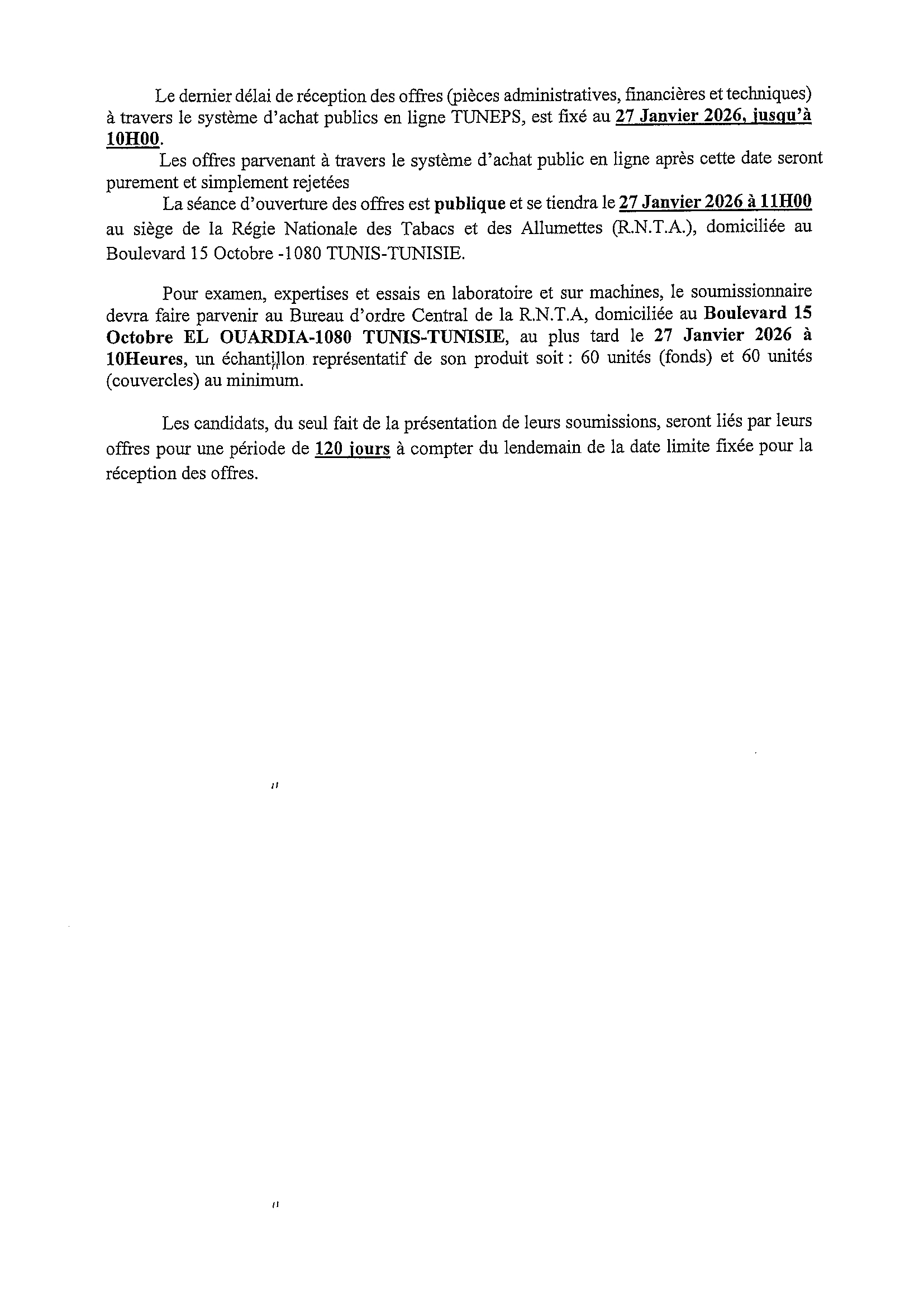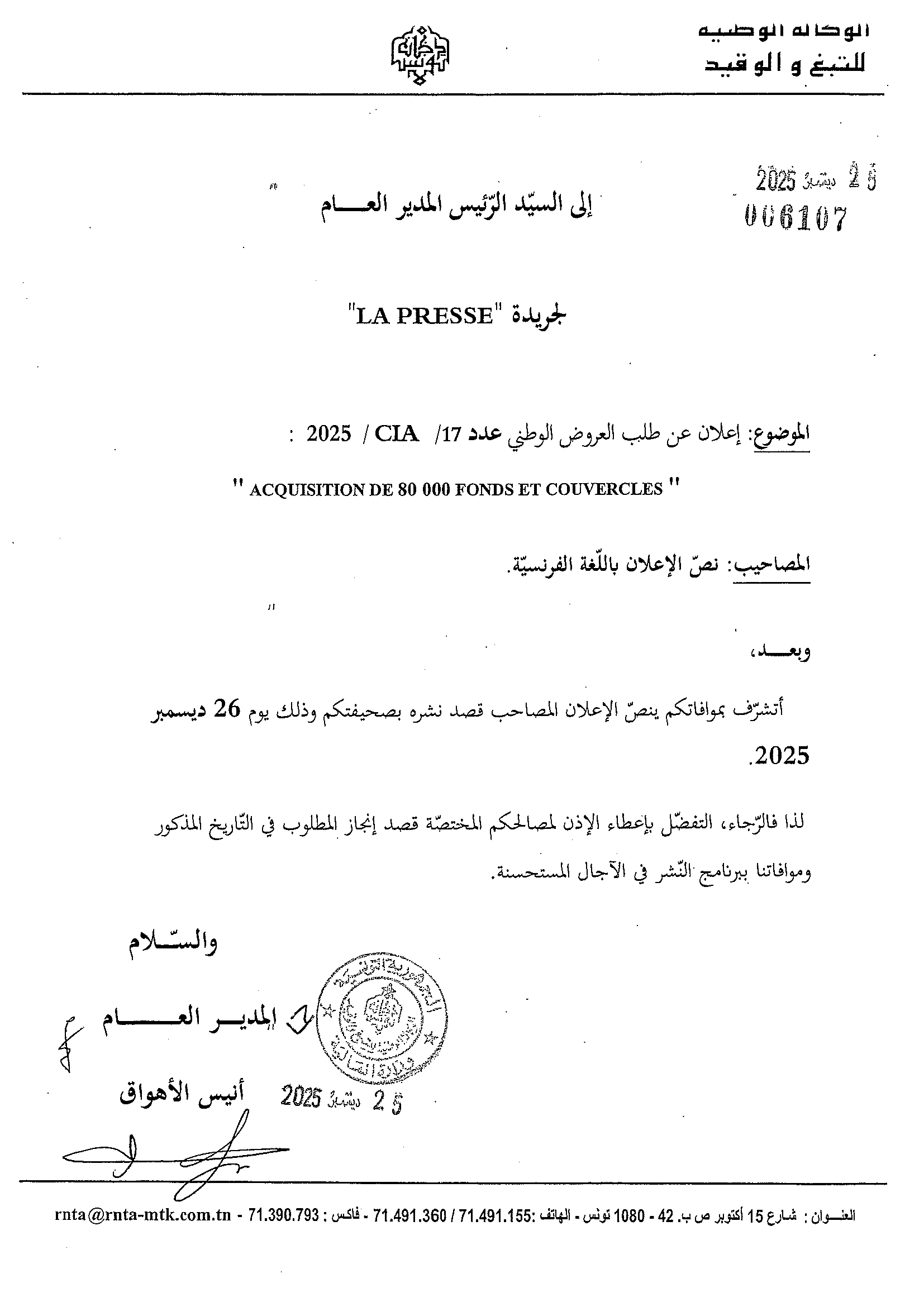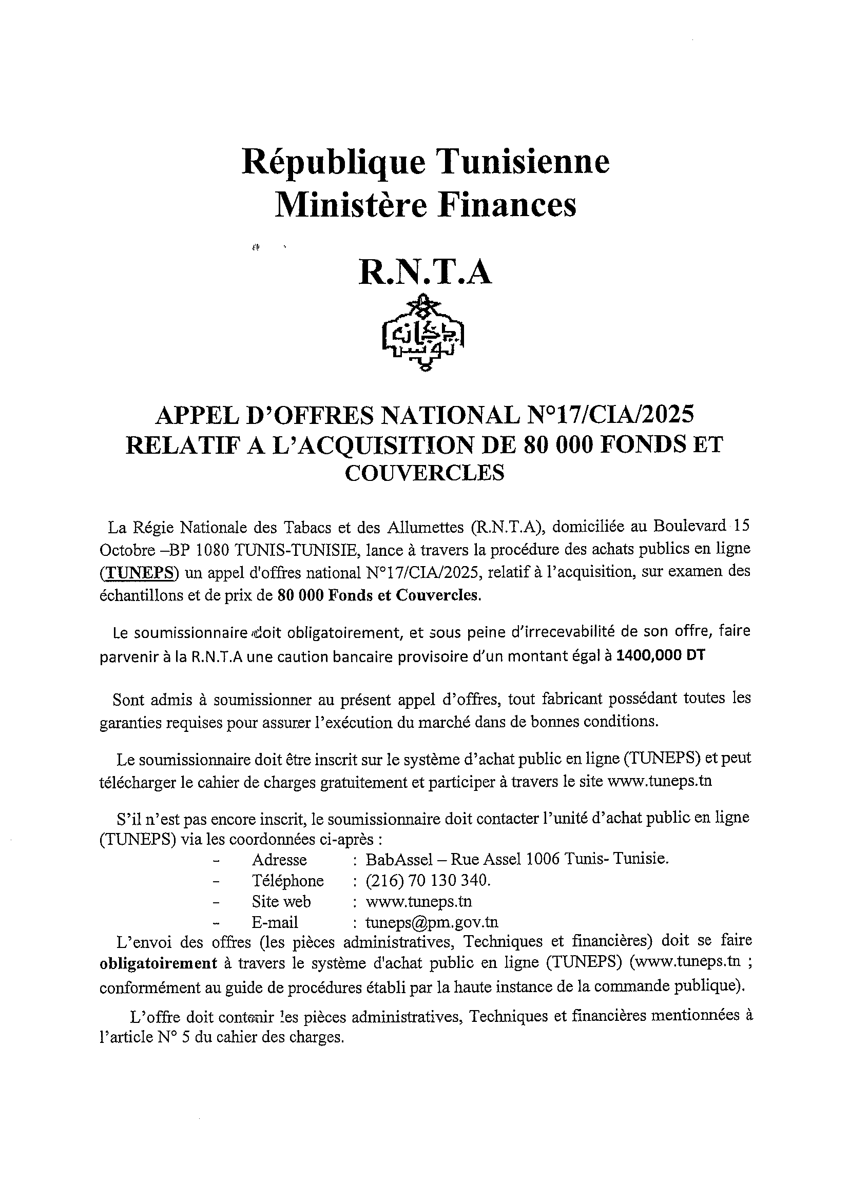 APPEL D'OFFRES NATIONAL N°17/CIA/2025 RELATIF A L'ACQUISITION DE 80 000 FONDS ET COUVERCLES
