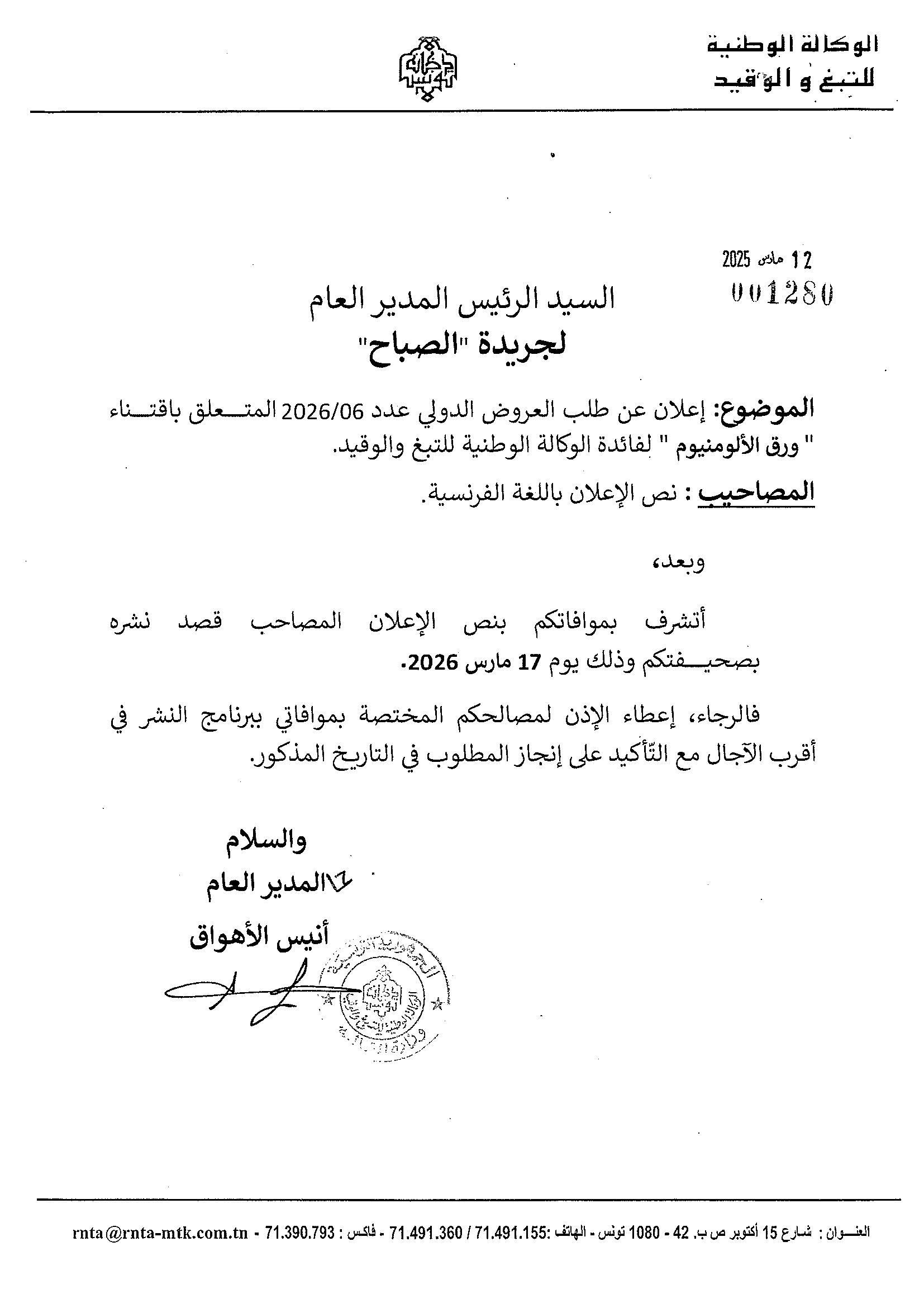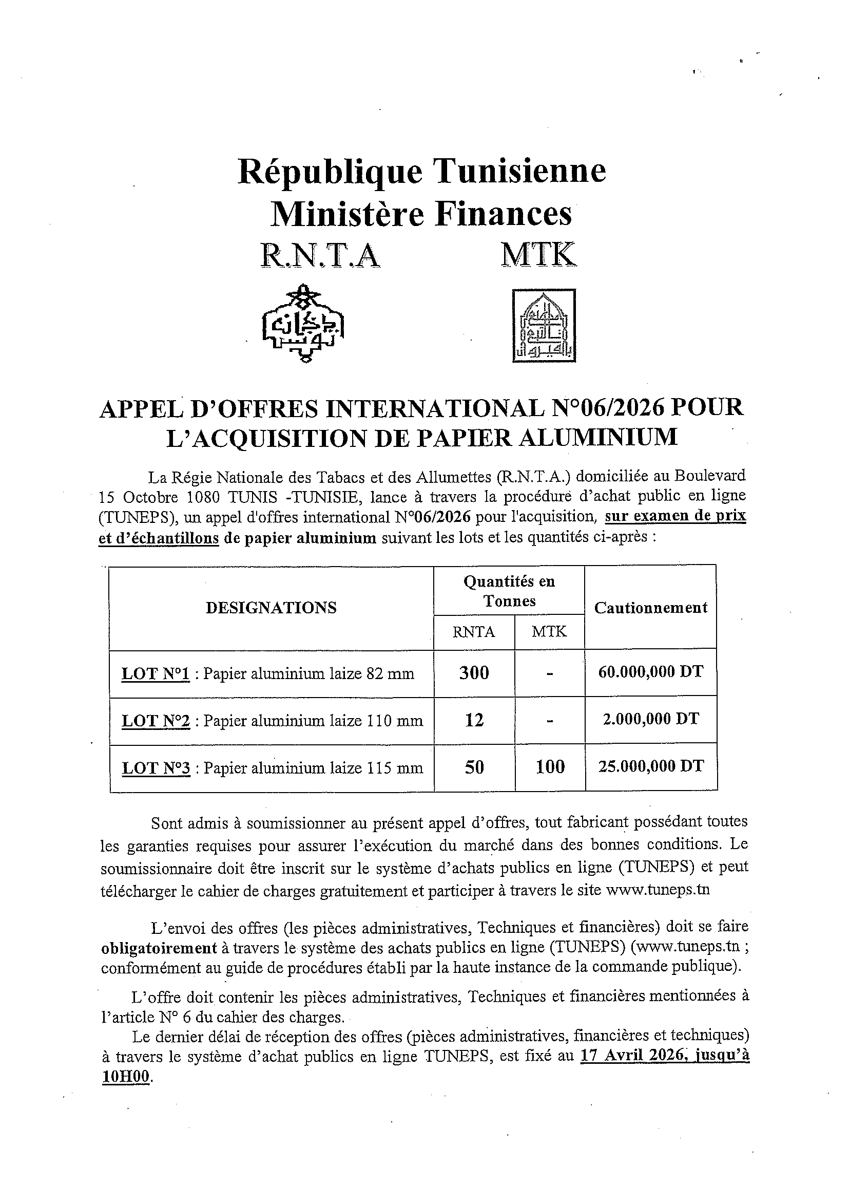 APPEL D'OFFRES INTERNATIONAL N°06/2026 POUR L'ACQUISITION DE PAPIER ALUMINIUM