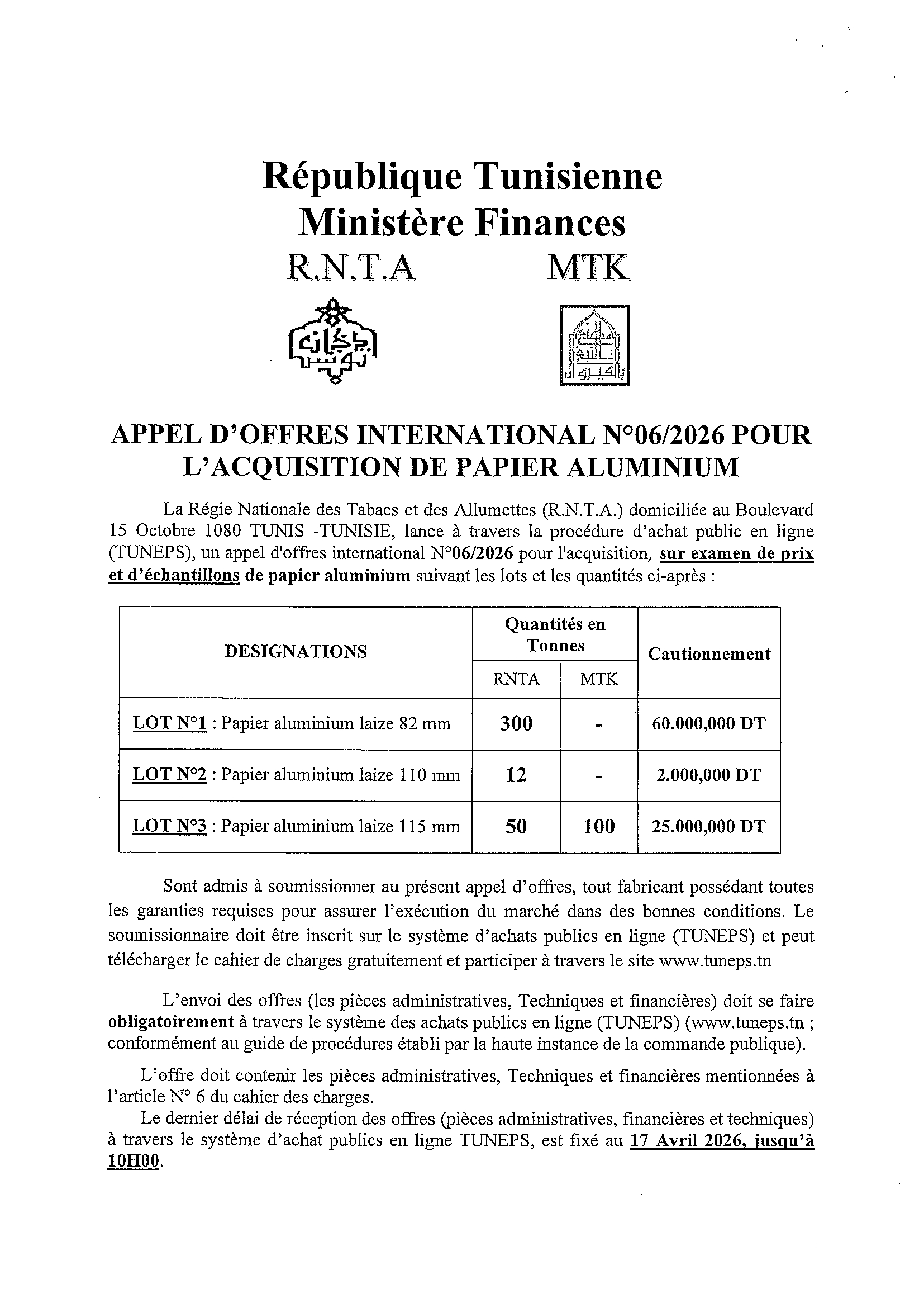 APPEL D'OFFRES INTERNATIONAL N°06/2026 POUR L'ACQUISITION DE PAPIER ALUMINIUM