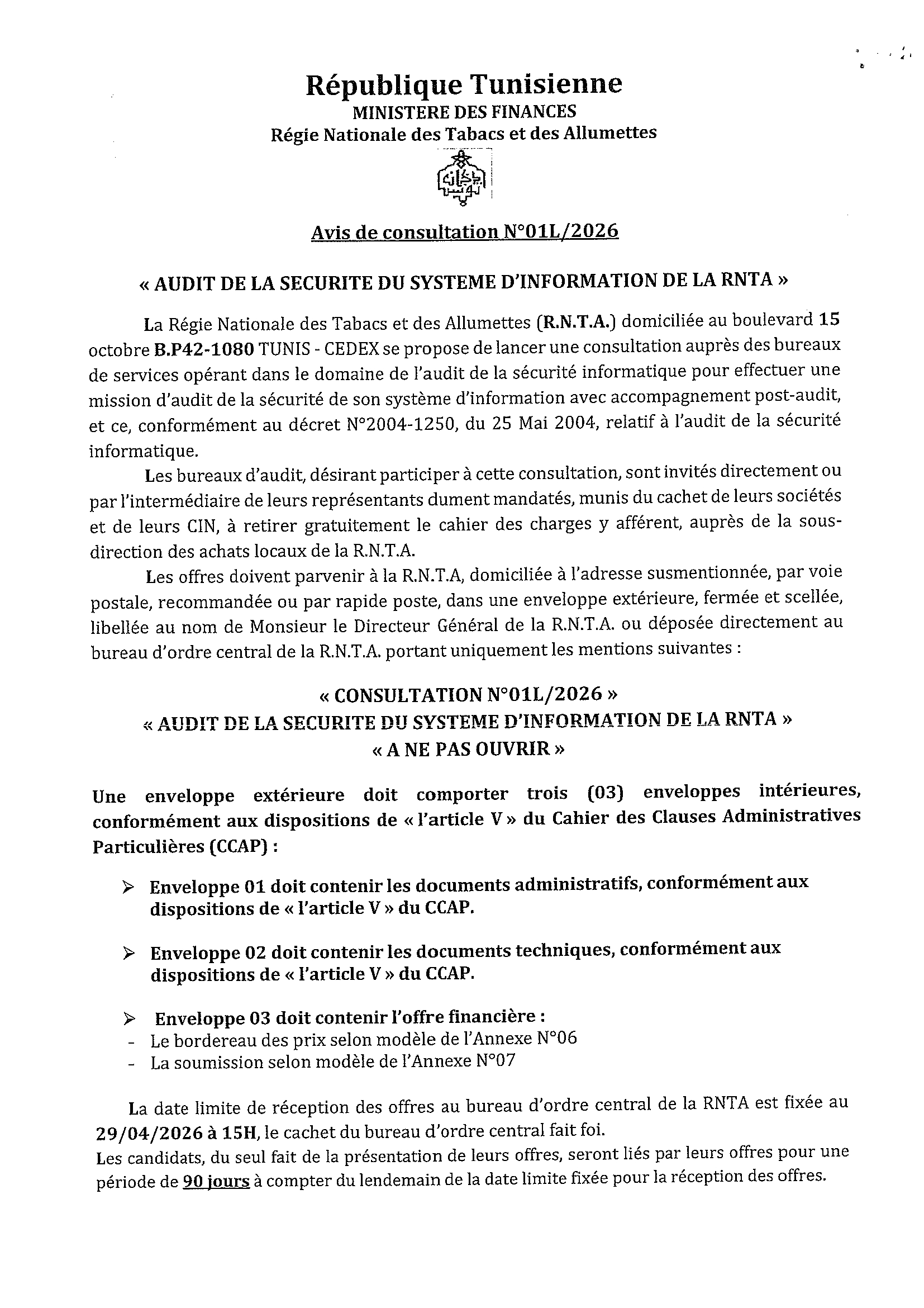 Avis de consultation N°01L/2026 << AUDIT DE LA SECURITE DU SYSTEME D'INFORMATION DE LA RNTA »